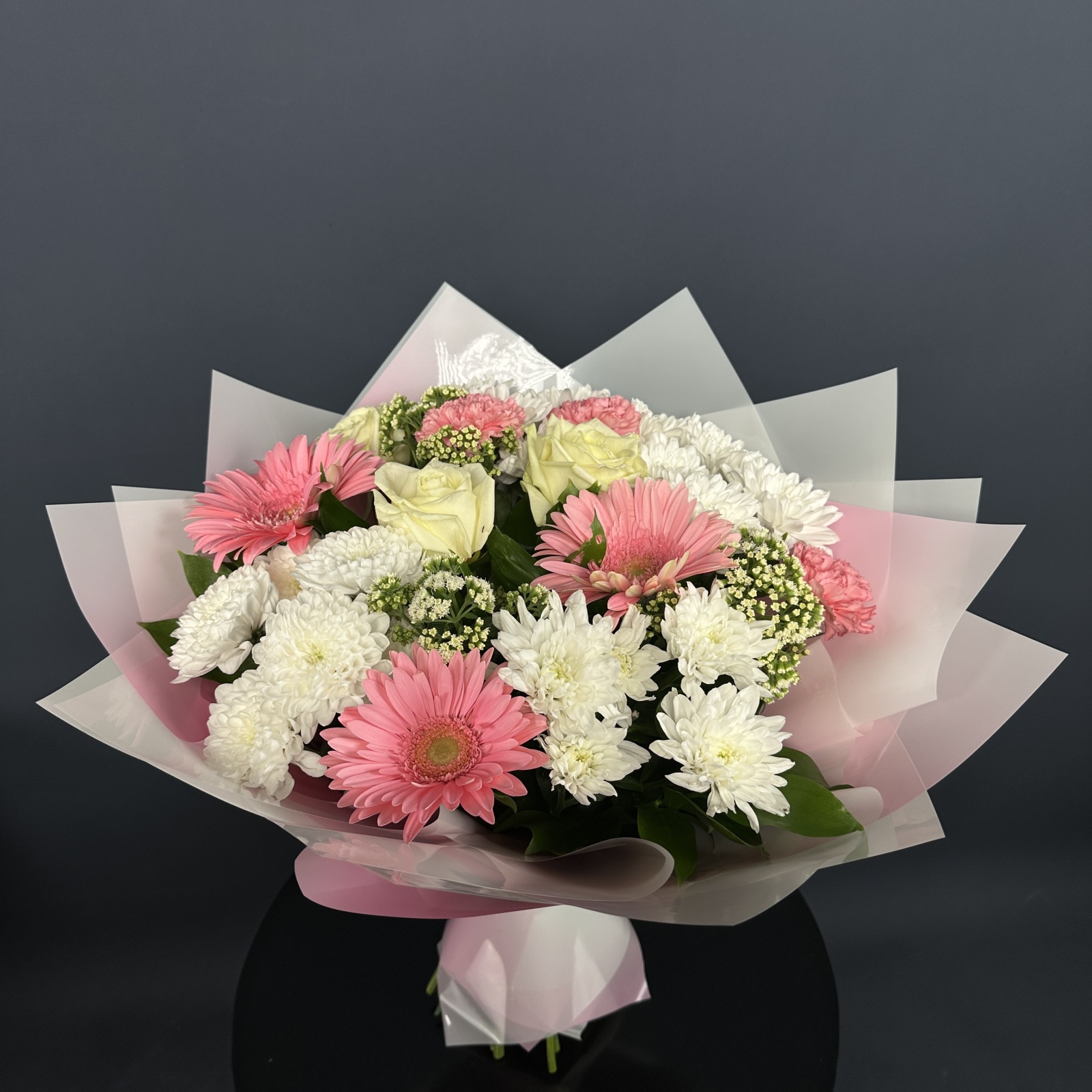 Состав: роза 4, хризантема кустовая 4, гербера 3, гвоздика 3, хамелациум 1, рускус 0,5 и прочее.
