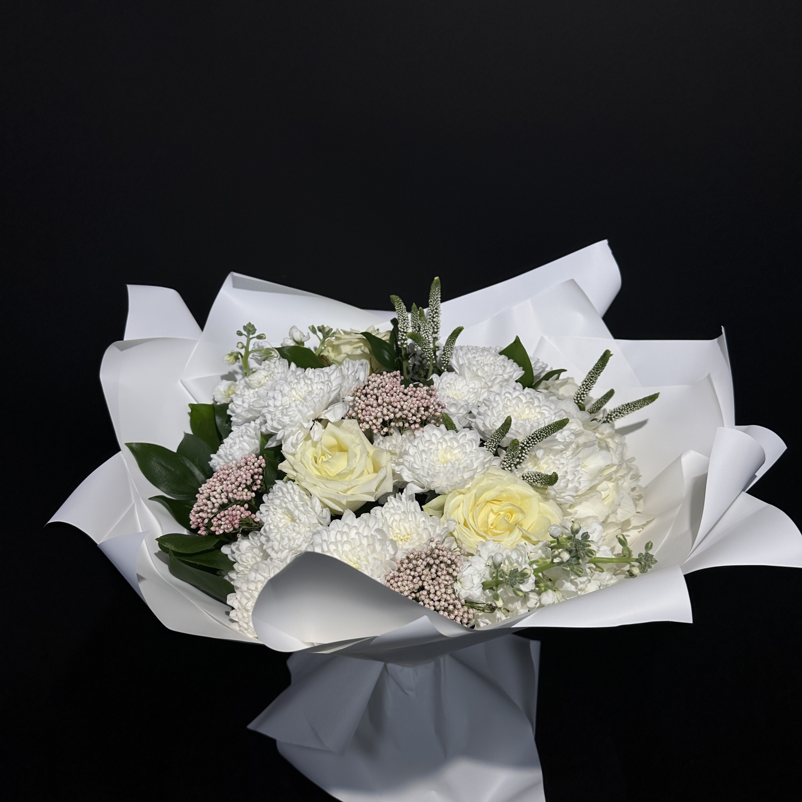 Состав: роза 5, хризантема кустовая 4, маттиола 3, рускус 0,7 и прочее. под заказ