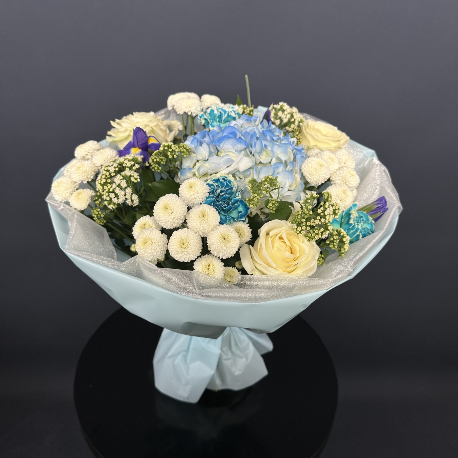 Состав: хризантема кустовая 5, роза 3, гвоздика 3, гортензия 1, рускус 0,5 и прочее.