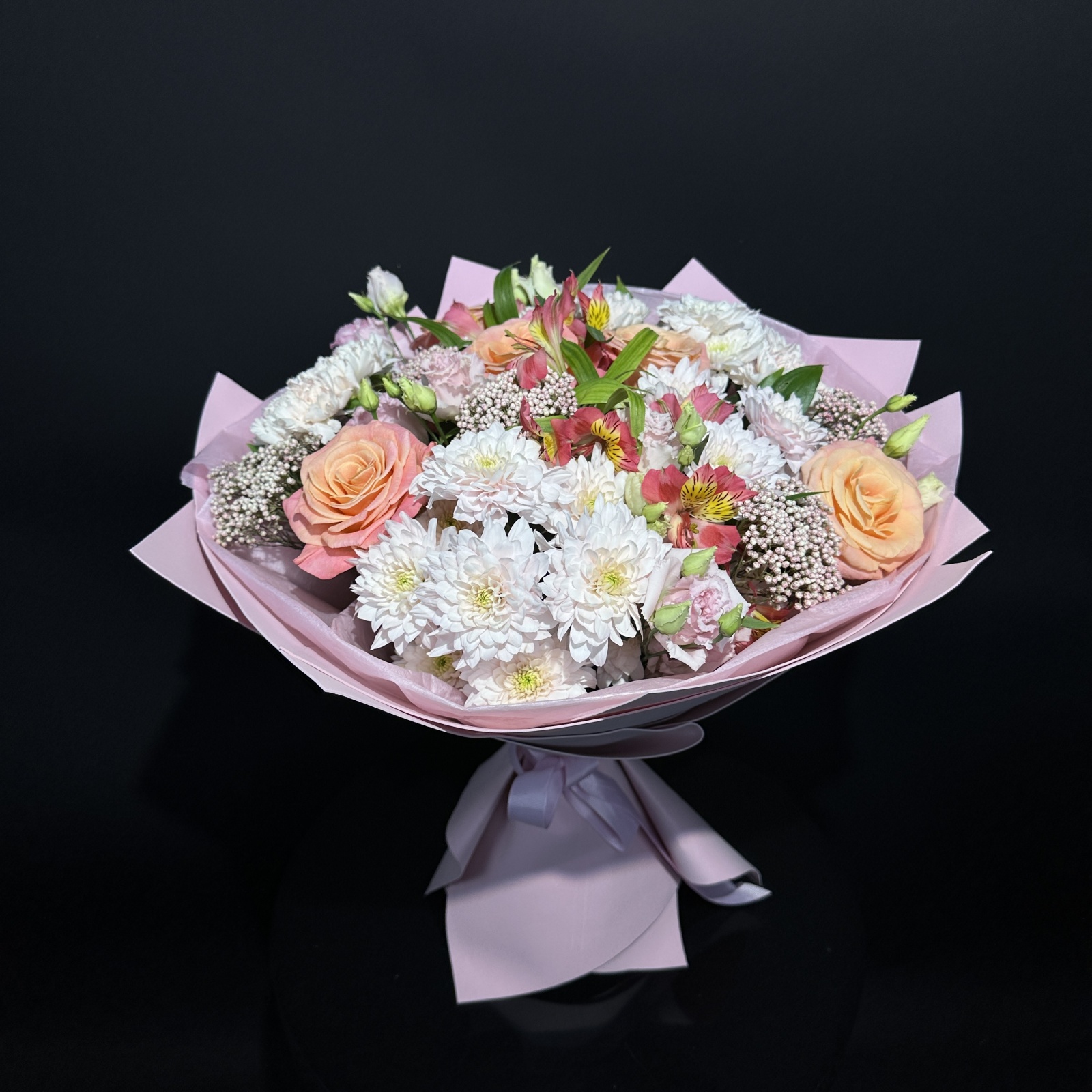 Состав: роза 5, гвоздика 5, хризантема кустовая 4, альстромерия 3, лизиантус 2, рускус 0,2 и прочее.