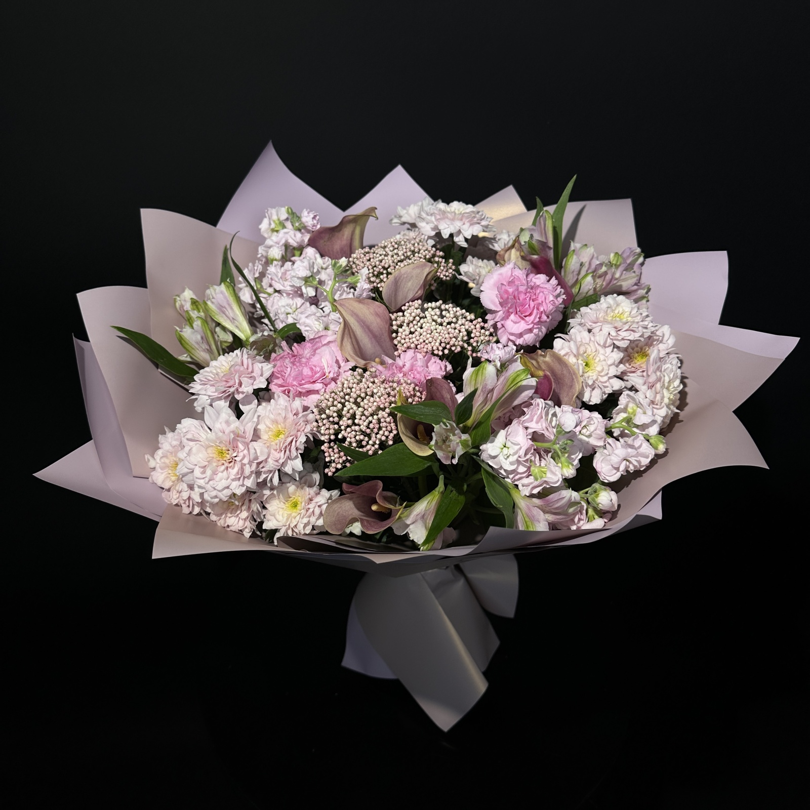 Состав: альстромерия 3, гвоздика 3, хризантема кустовая 3, маттиола 2 и прочее. в наличии