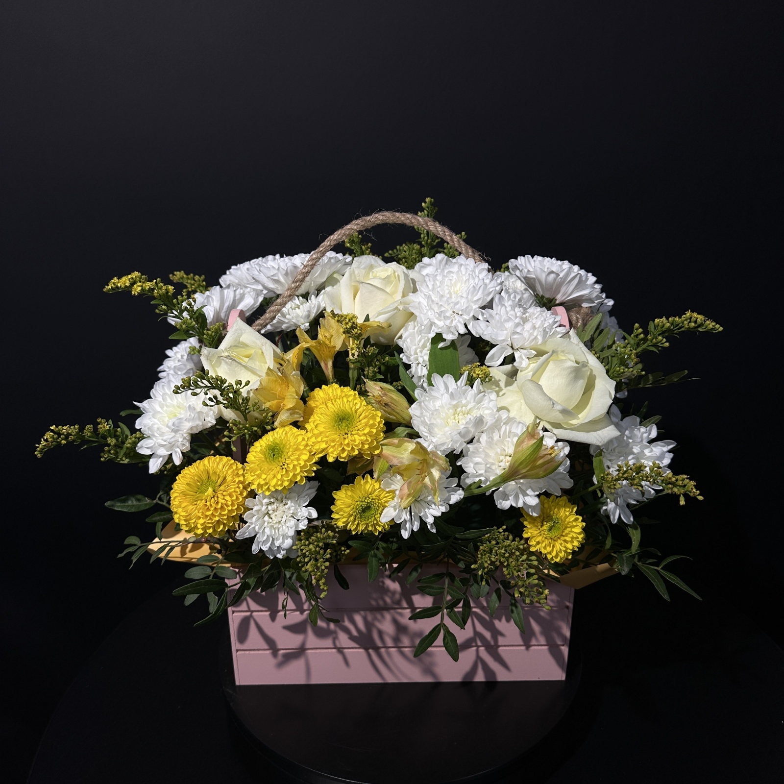 Состав: хризантема кустовая 4, роза 3, альстромерия 3, солидаго 2, фисташка 1 и прочее.