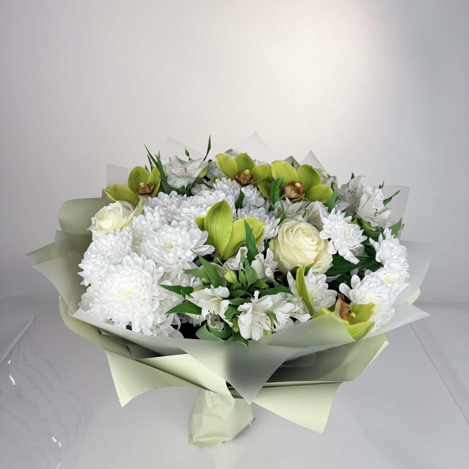Состав: альстромерия 4, хризантема кустовая 4, роза 2, рускус 0,5, ветка цимбидиум 0,5 и прочее. в наличии