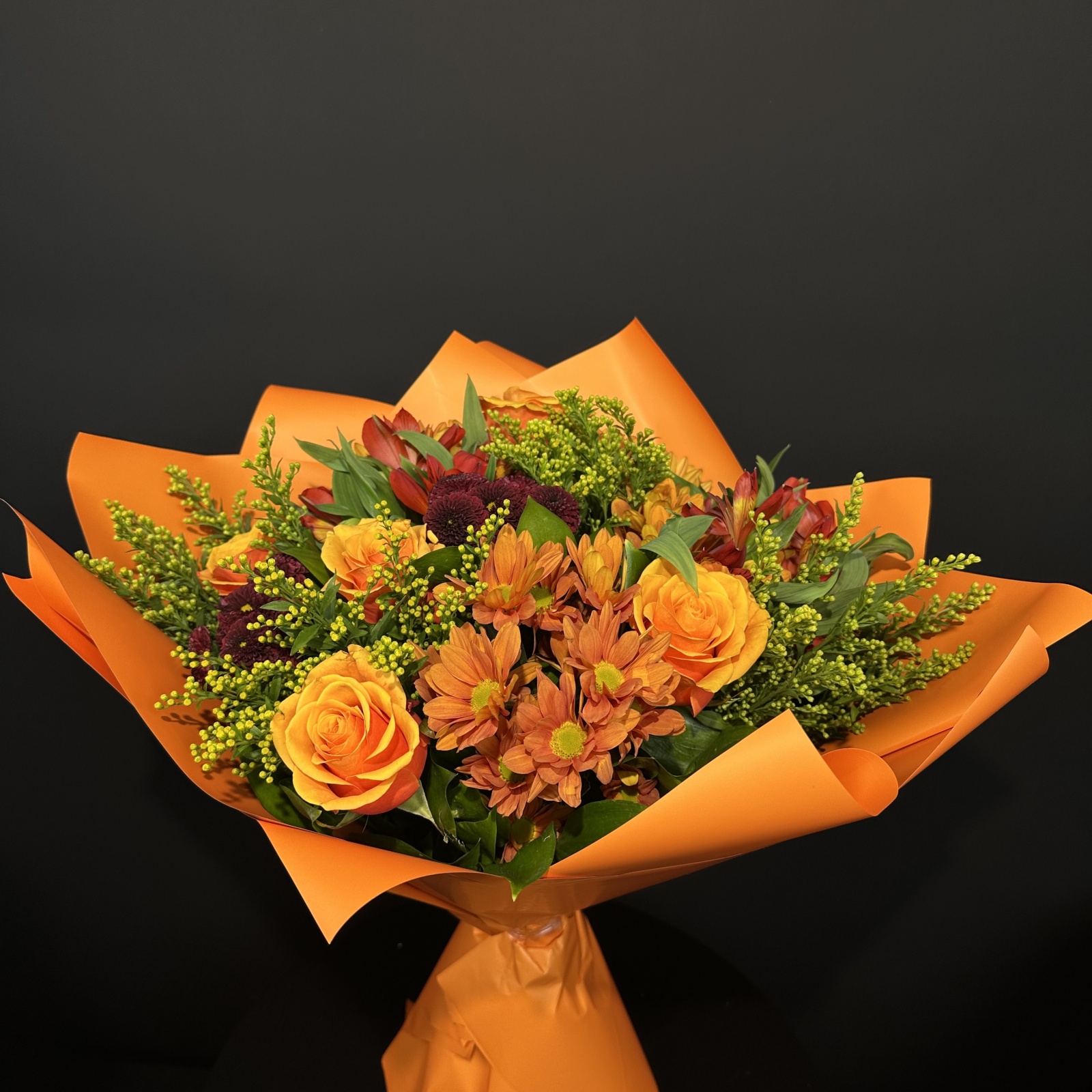 Состав: роза 5, хризантема кустовая 4, солидаго 4, альстромерия 3, хризантема 3 и прочее. в наличии