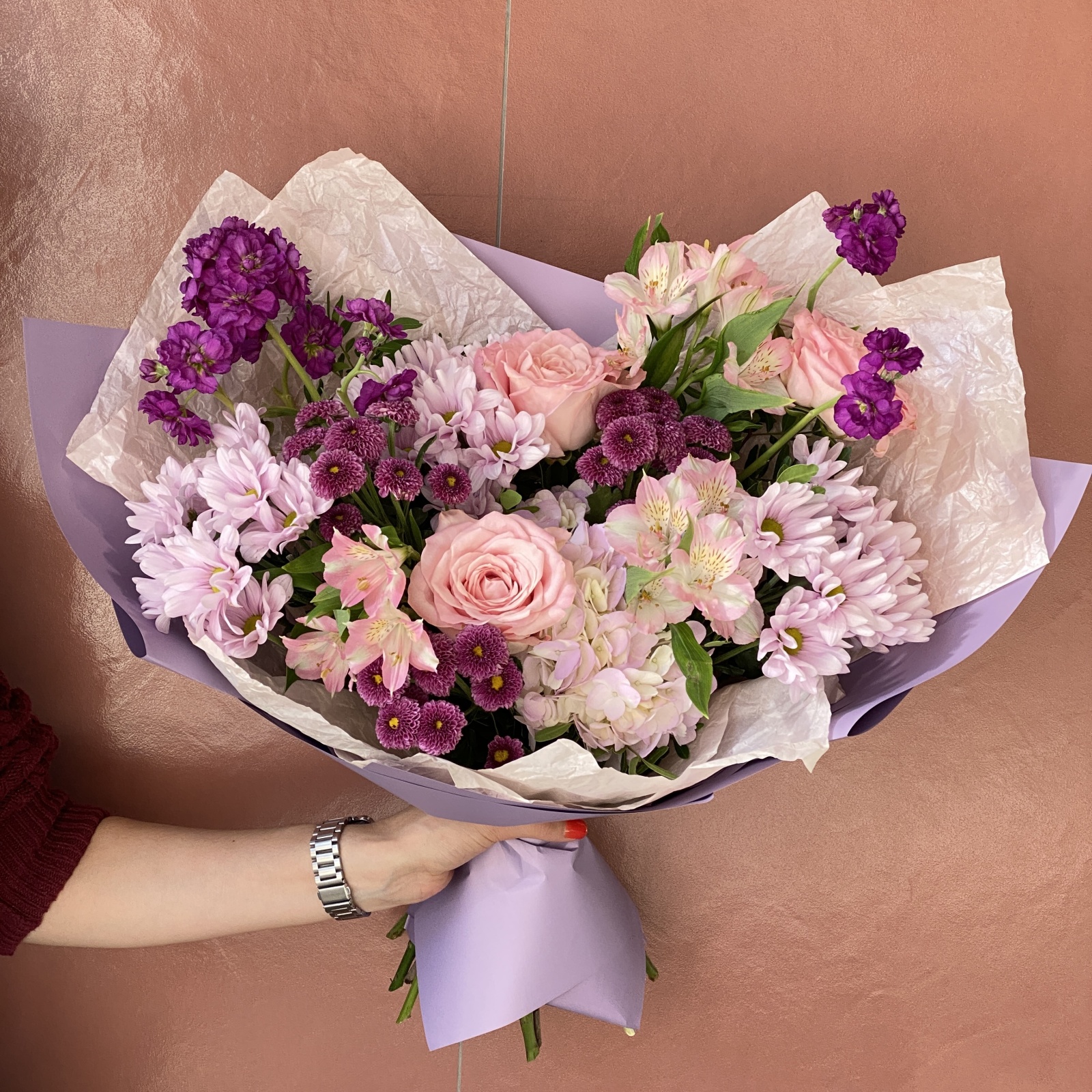 Состав: хризантема 3, роза 3, альстромерия 3, хризантема кустовая 3, маттиола 2, гортензия 1, фисташка 0,5 и прочее.