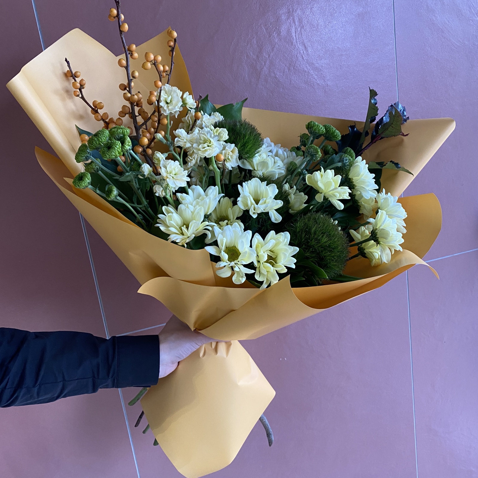 Состав: хризантема кустовая 5, гвоздика 3, лимониум 2, рускус 0,7 и прочее. под заказ