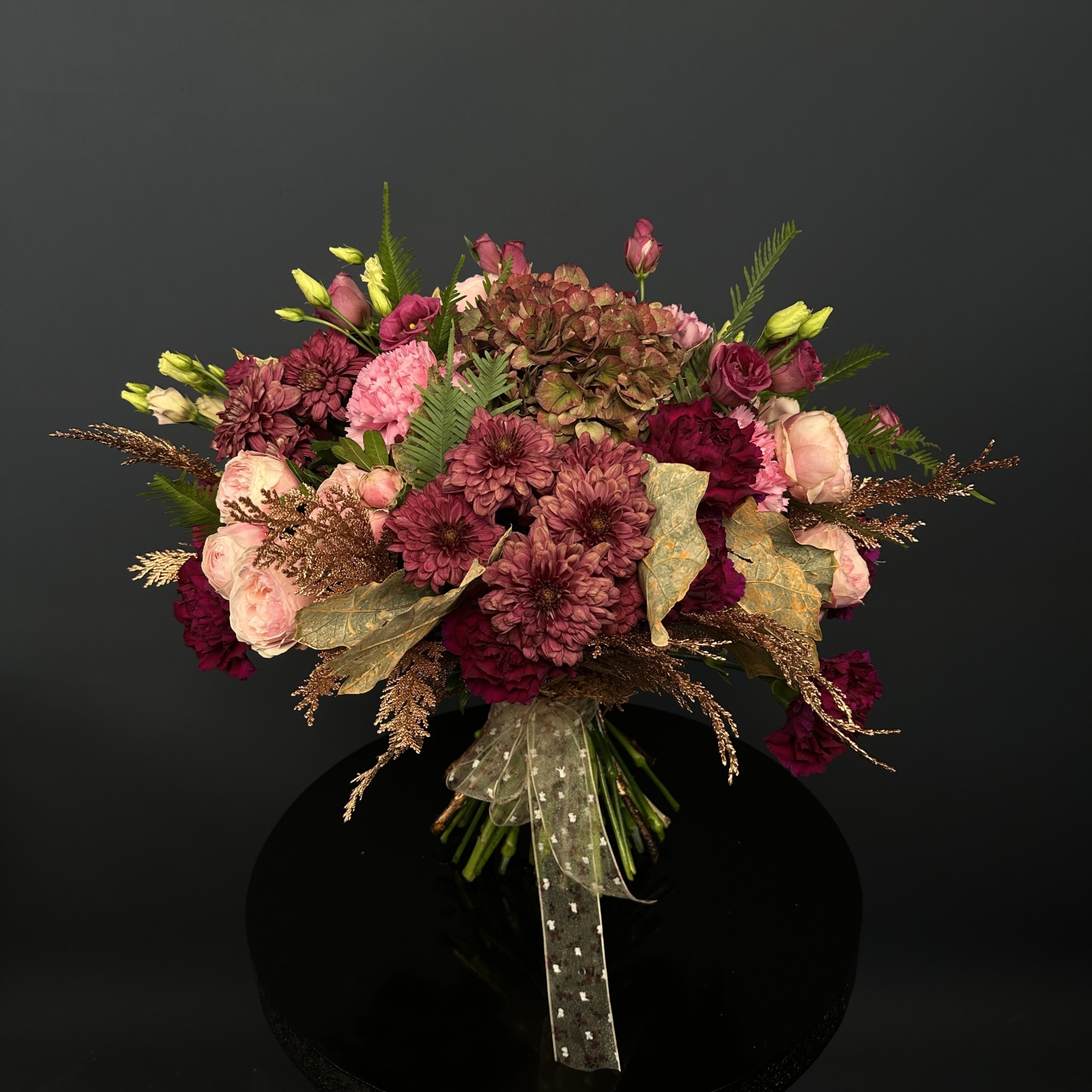 Состав: гвоздика 12, хризантема кустовая 4, лизиантус 4, роза кустовая 3, фисташка 0,3 и прочее.