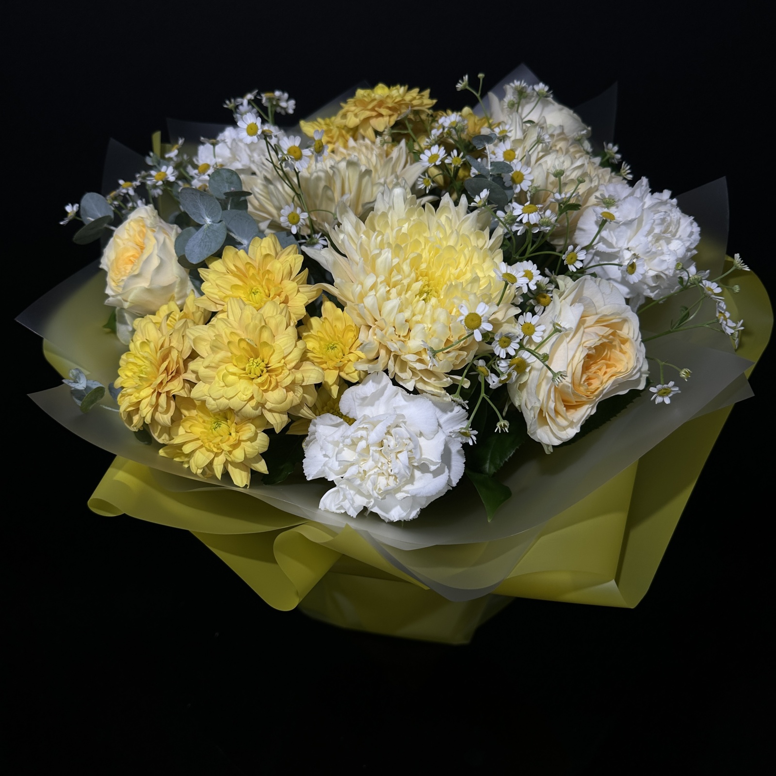 Состав: гвоздика 4, хризантема 3, роза 3, альстромерия 3, хризантема кустовая 2, эвкалипт 1, рускус 0,5 и прочее. под заказ