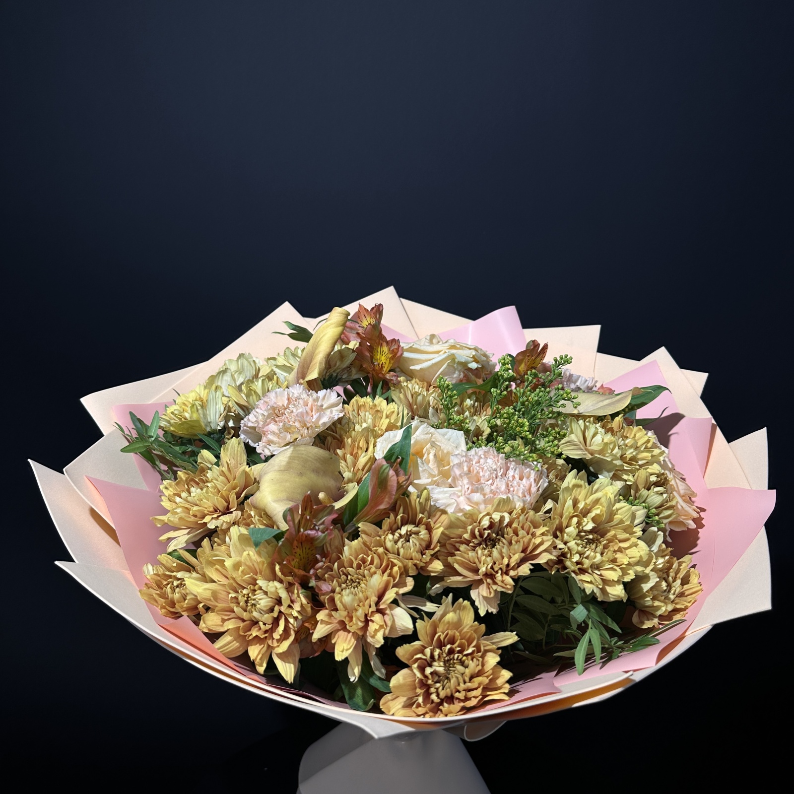 Состав: хризантема кустовая 5, роза 3, альстромерия 3, гвоздика 3, солидаго 1 и прочее. под заказ