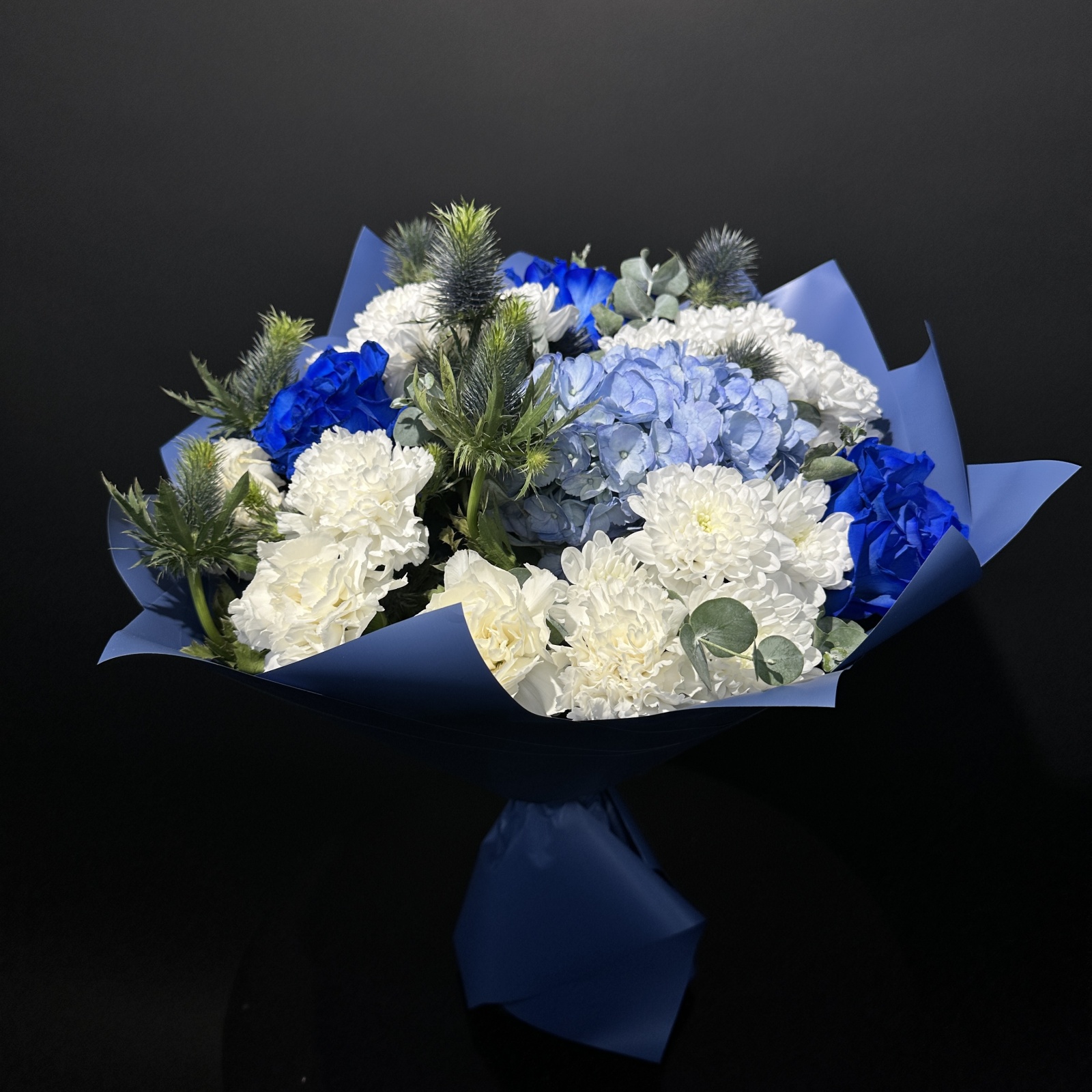 Состав: гвоздика 5, хризантема кустовая 3, роза 3, эрингиум 2, гортензия 1, ранункулюс 1 и прочее. в наличии