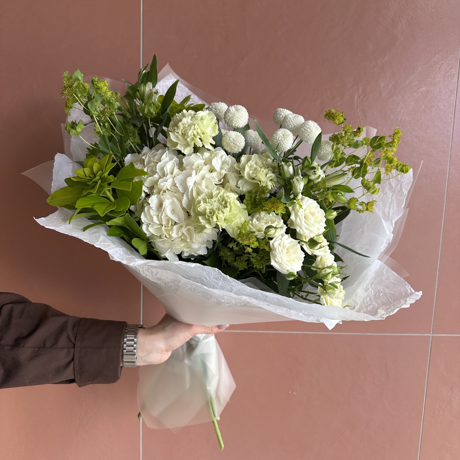 Состав: гвоздика 3, хризантема кустовая 2, альстромерия 2, чоисия 2, гортензия 1, роза кустовая 1, рускус 0,5 и прочее.