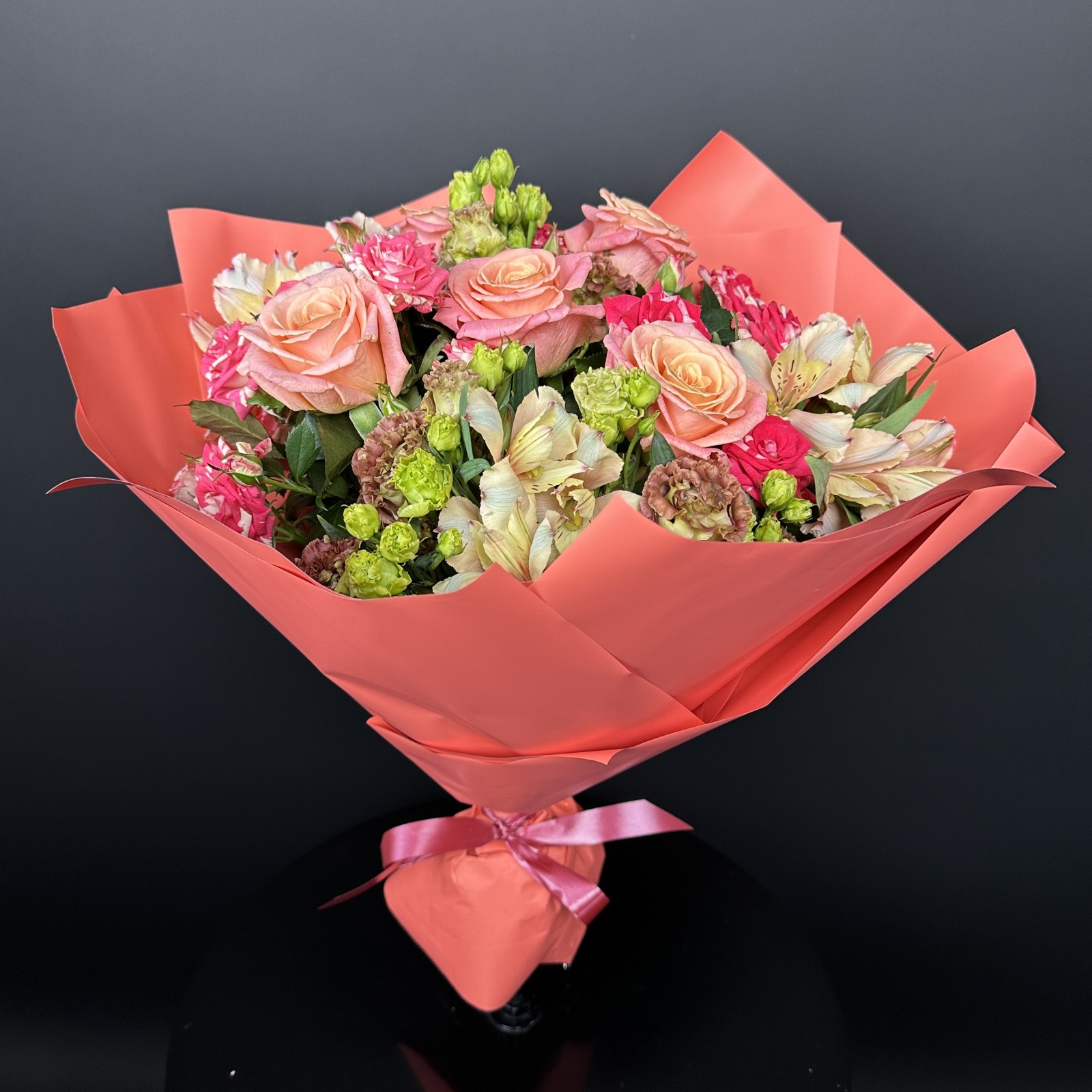 Состав: роза 5, альстромерия 3, лизиантус 3, роза кустовая 2 и прочее. под заказ
