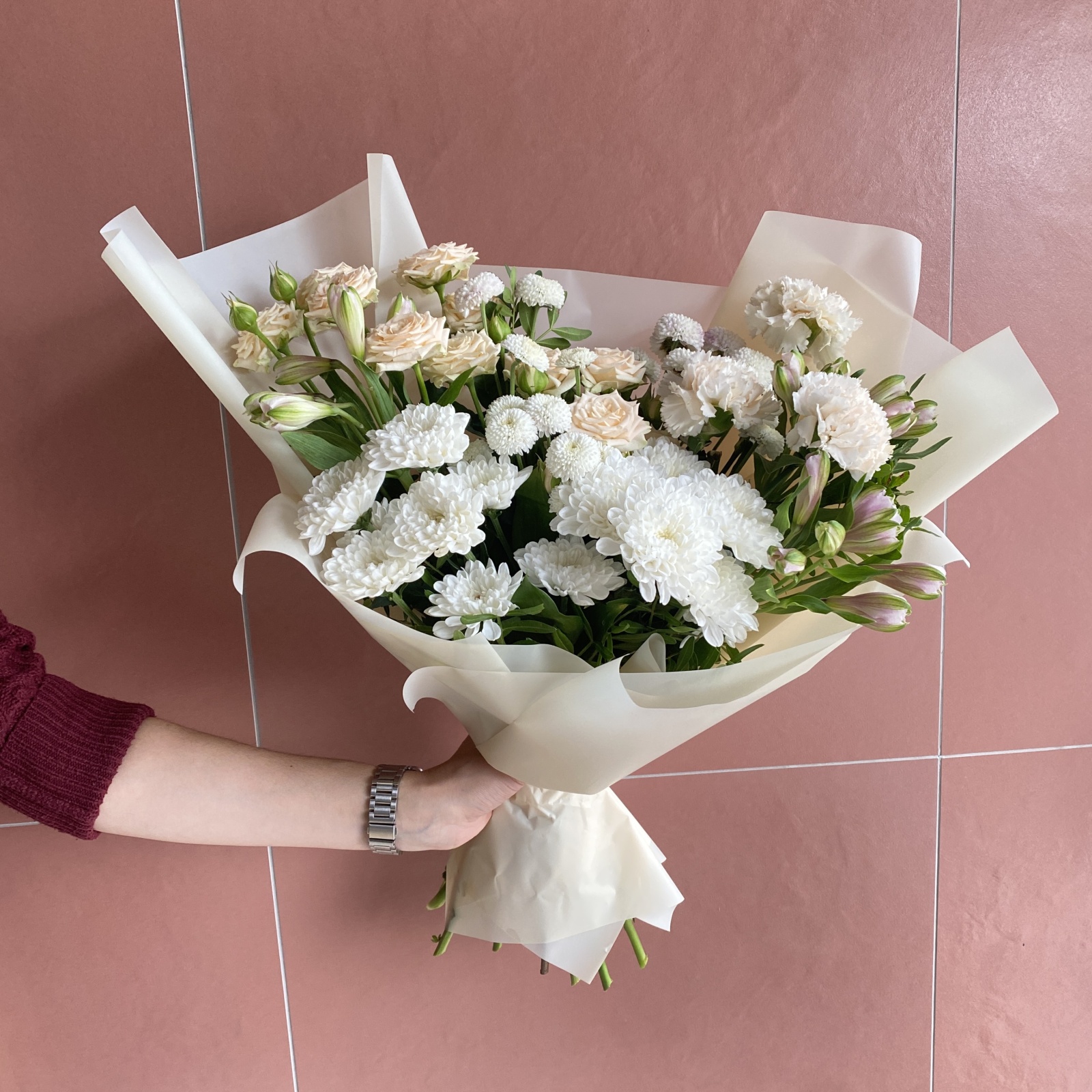 Состав: хризантема кустовая 5, альстромерия 3, гвоздика 3, роза кустовая 2, фисташка 0,3 и прочее.