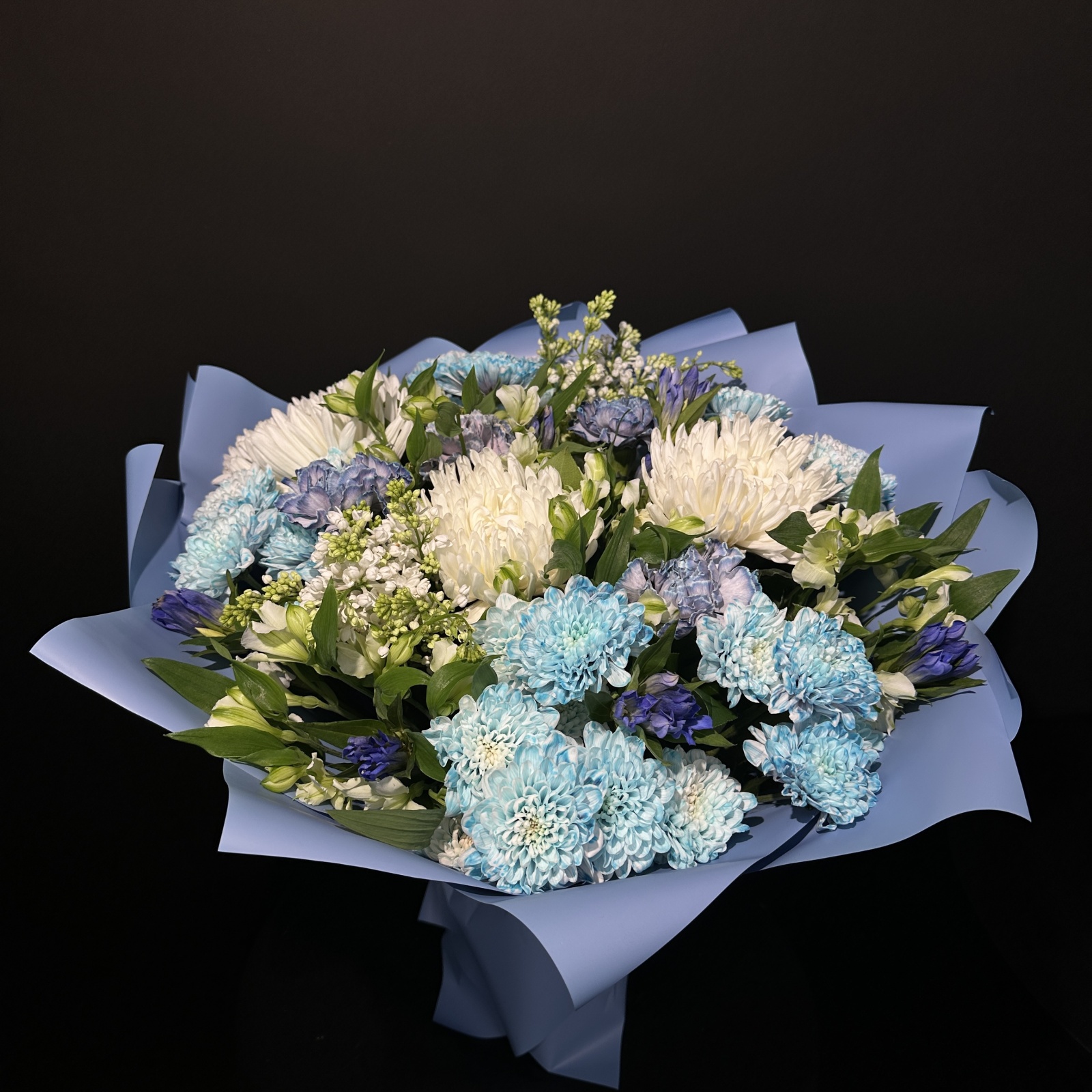 Состав: гвоздика 5, хризантема кустовая 5, альстромерия 4, хризантема 3, сирень 2, салал 0,5 и прочее. под заказ