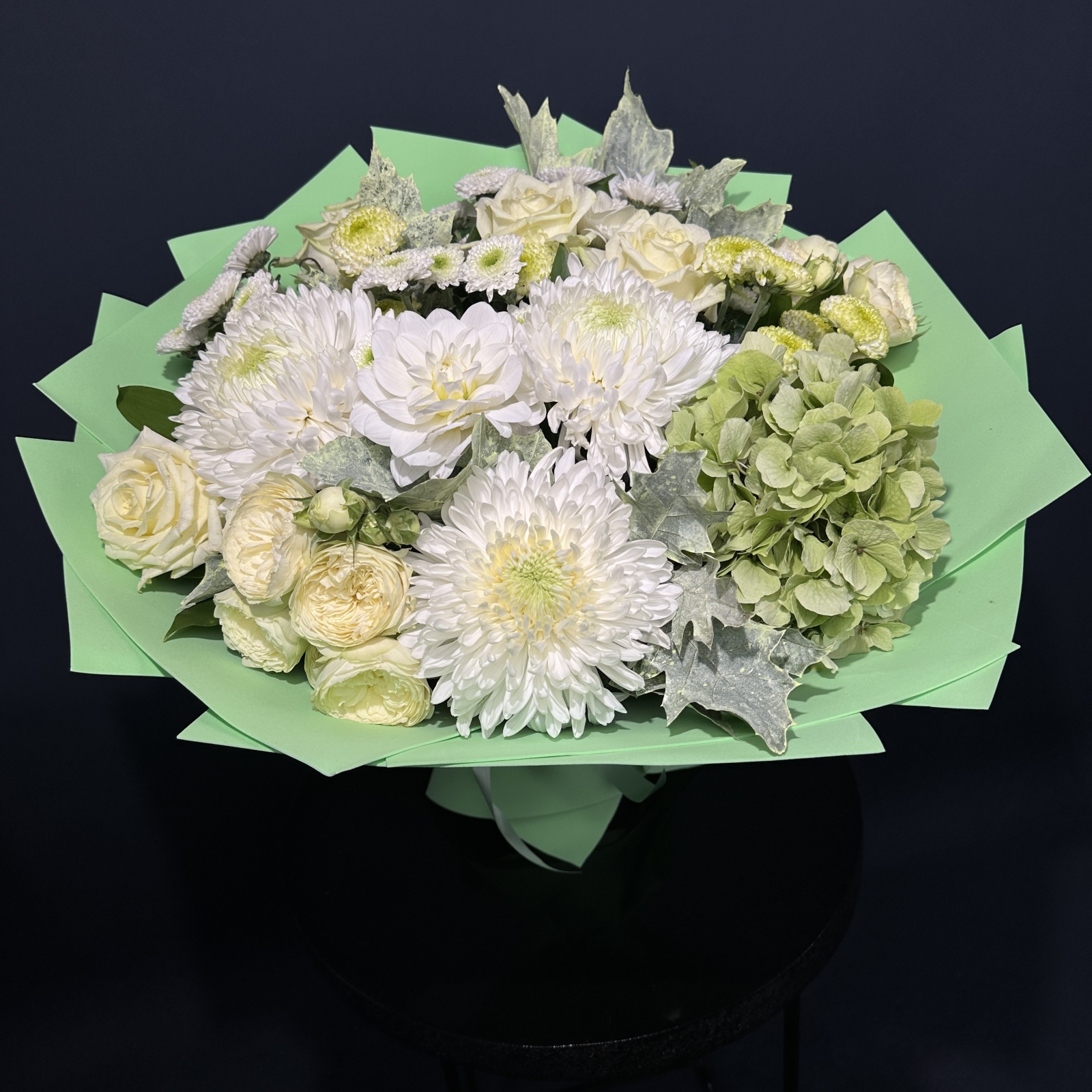 Состав: хризантема кустовая 6, роза 5, хризантема 3, роза кустовая 2, гортензия 1, рускус 0,5 и прочее. под заказ