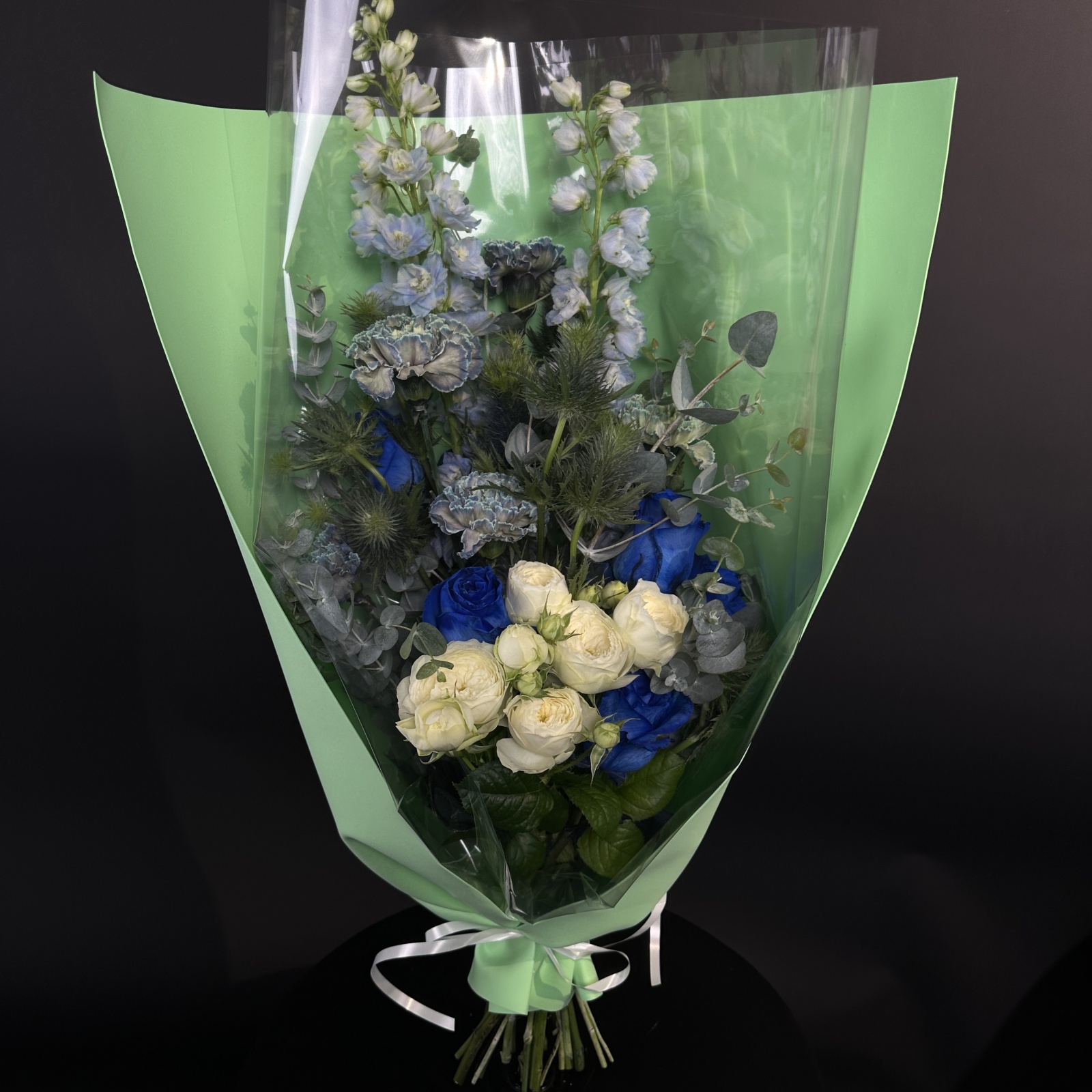 Состав: роза 5, гвоздика 5, дельфиниум 2, эвкалипт 1, эрингиум 1, роза кустовая 1 и прочее.