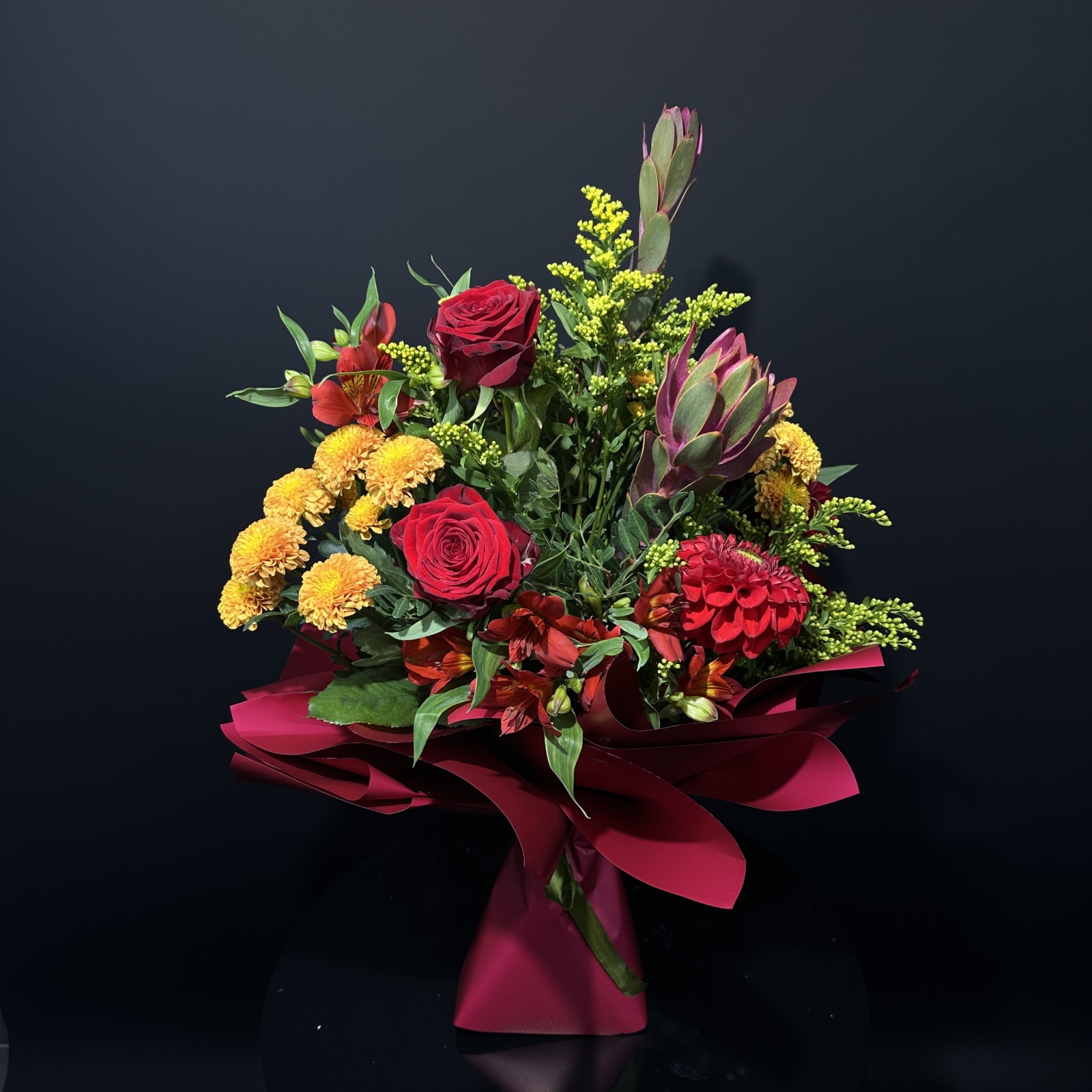Состав: роза 3, хризантема кустовая 3, солидаго 3, леукадендрон 2, альстромерия 2, цветок ванды 1, фисташка 0,5 и прочее.