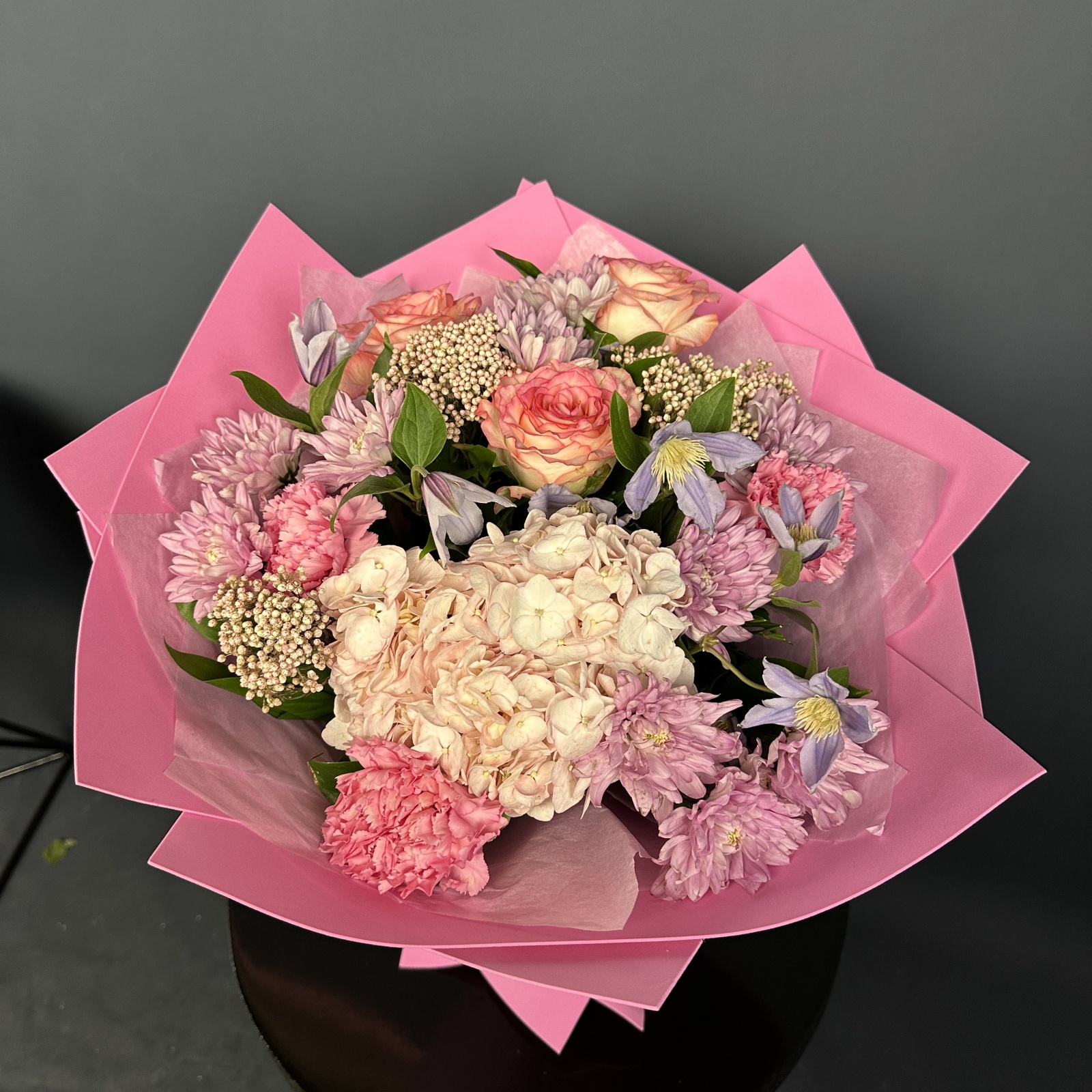 Состав: хризантема кустовая 5, роза 3, гвоздика 3, клематис 3, гортензия 1, рускус 0,5 и прочее.