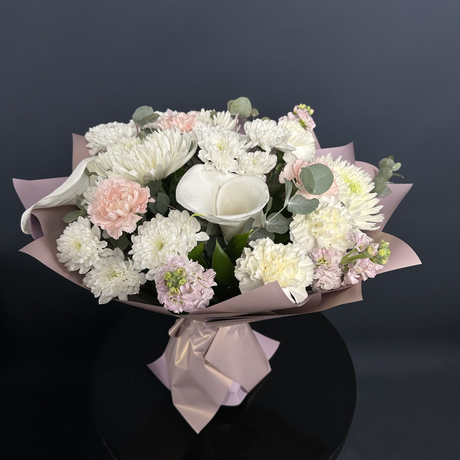Состав: гвоздика 7, хризантема кустовая 3, маттиола 3, хризантема 3, эвкалипт 1, рускус 0,5 и прочее.