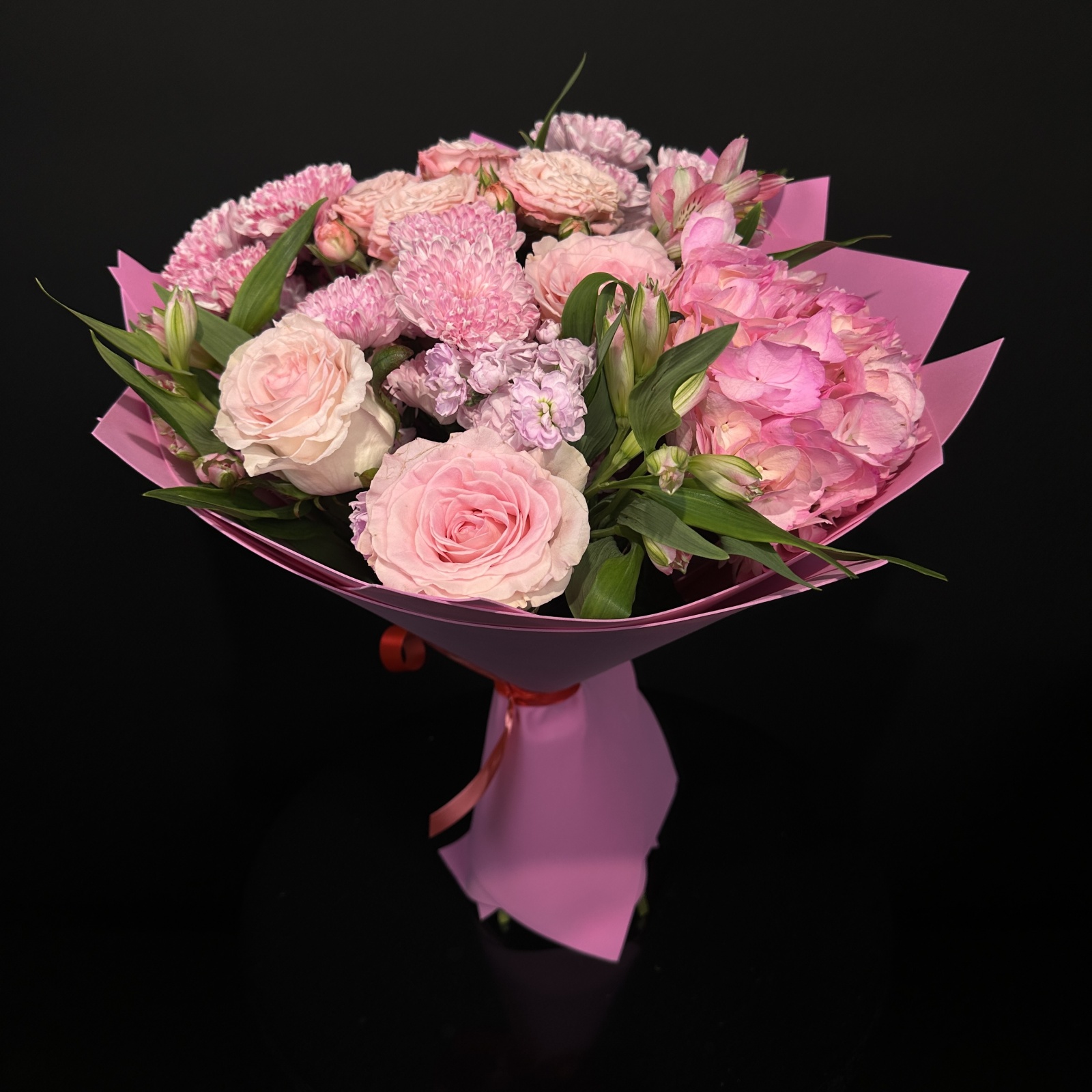 Состав: роза 3, альстромерия 3, хризантема кустовая 3, аралия 2, маттиола 2, гортензия 1, роза кустовая 1 и прочее.
