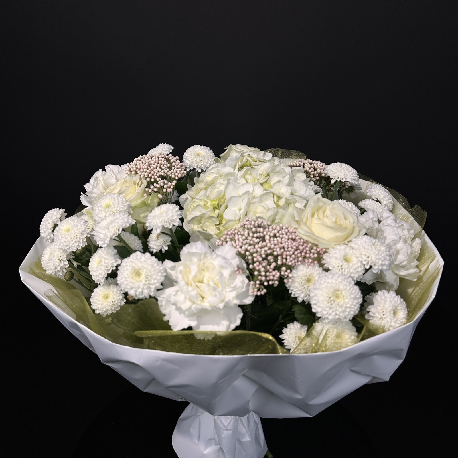 Состав: хризантема кустовая 5, роза 4, гвоздика 3, гортензия 1, рускус 0,5 и прочее. под заказ