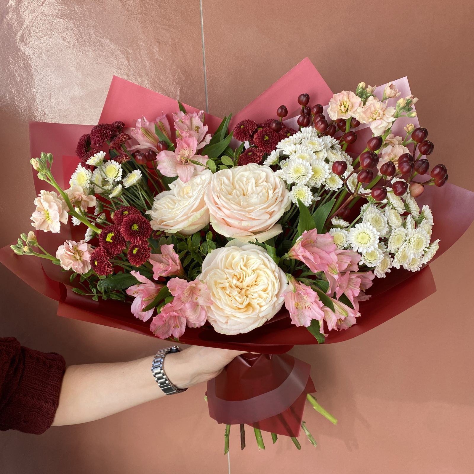 Состав: хризантема 3, роза 3, альстромерия 3, хризантема кустовая 3, гиперикум 2, маттиола 2, фисташка 0,3 и прочее.