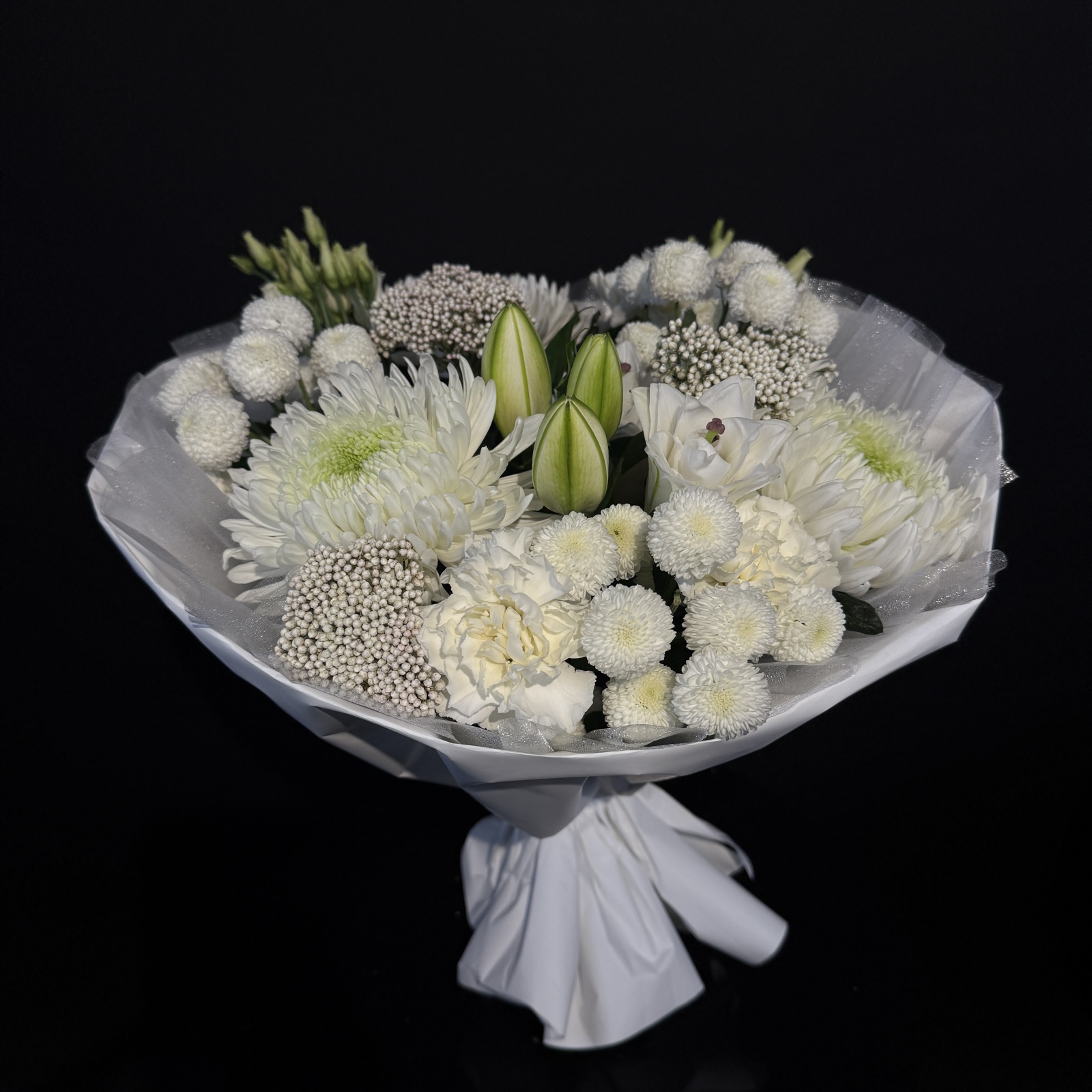 Состав: хризантема 3, гвоздика 3, хризантема кустовая 3, лизиантус 2, лилия 1, ранункулюс 1 и прочее. под заказ