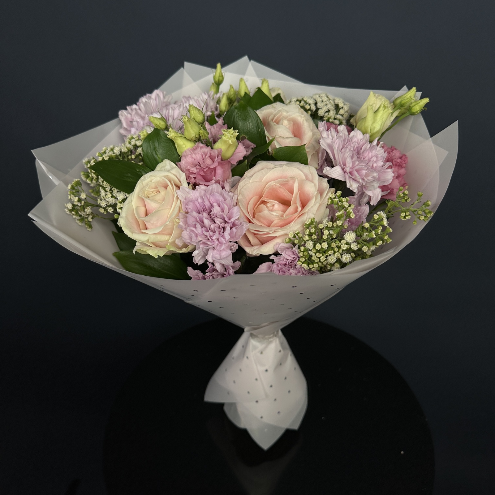 Состав: роза 3, хризантема кустовая 3, лизиантус 3, рускус 0,3 и прочее.