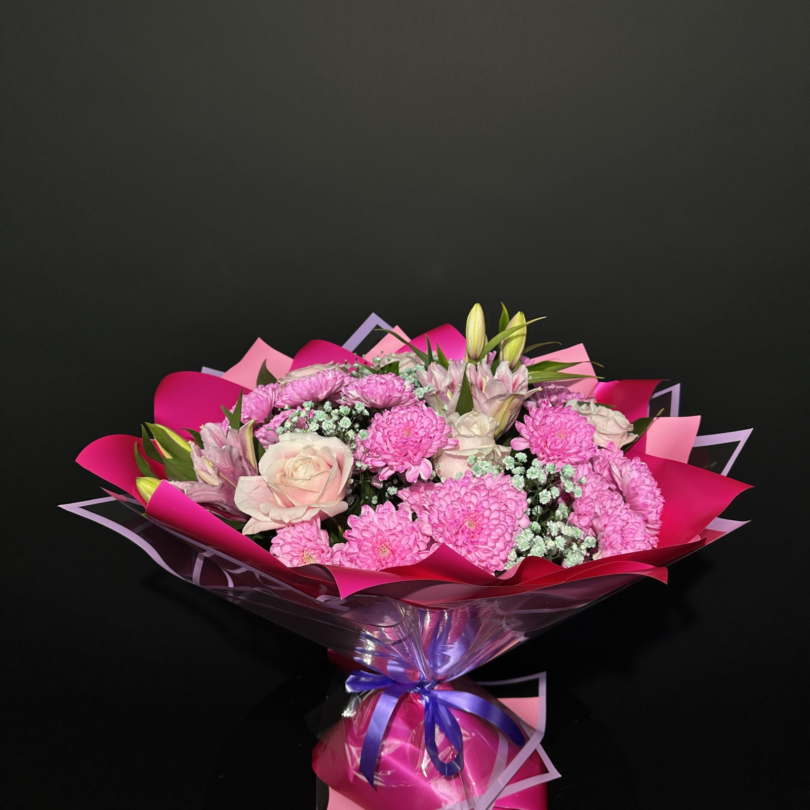 Состав: роза 7, хризантема кустовая 5, лилия 2, рускус 0,5 и прочее. в наличии