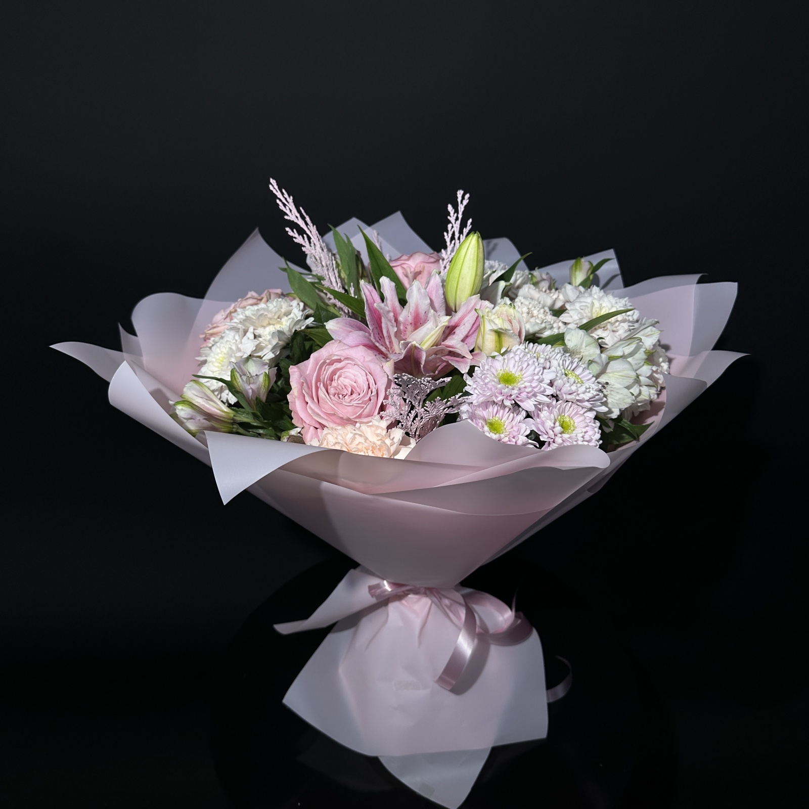 Состав: гвоздика 5, хризантема кустовая 4, альстромерия 4, роза 3, лилия 1 и прочее.