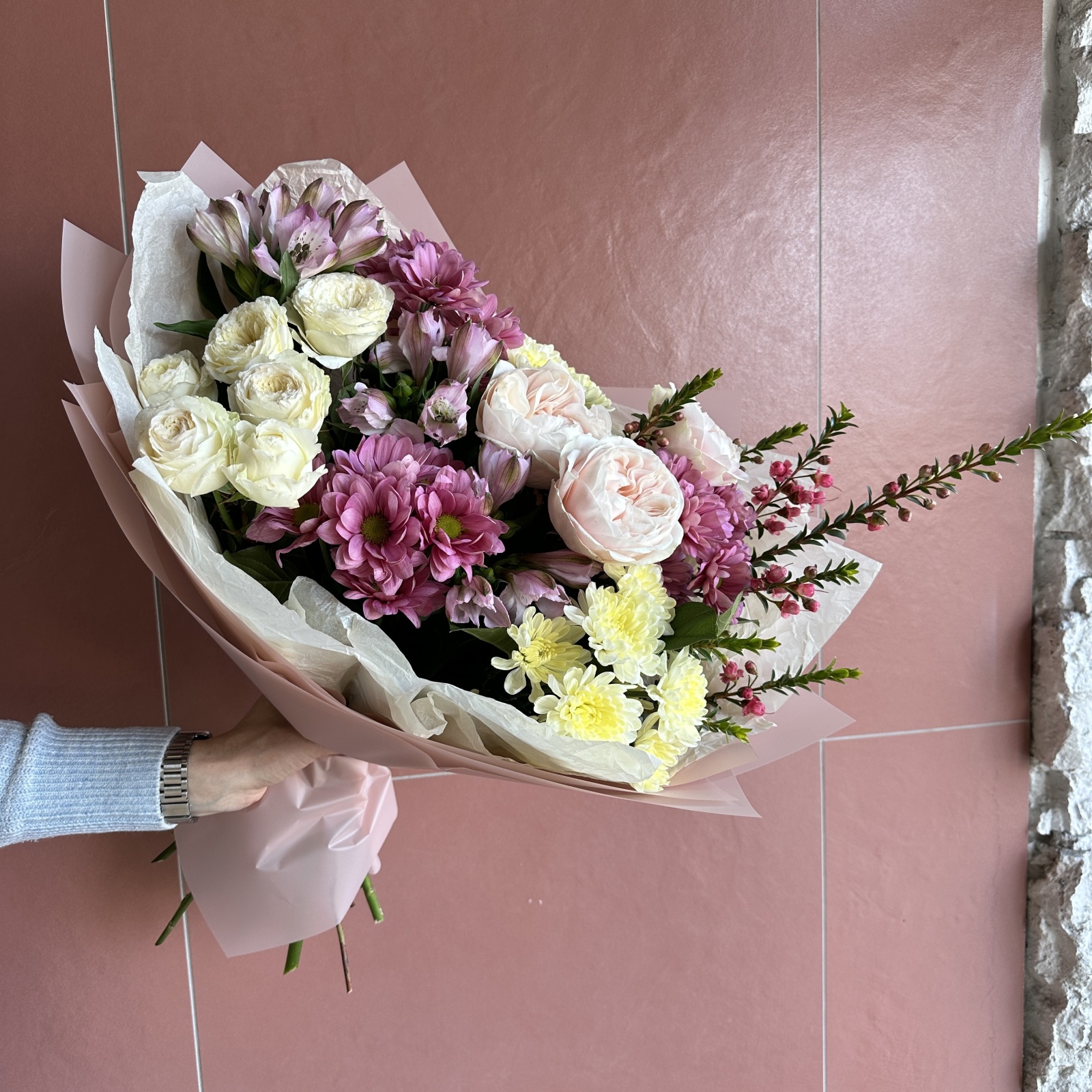 Состав: хризантема кустовая 5, альстромерия 4, роза 3, хамелациум 1, салал 0,5 и прочее. под заказ