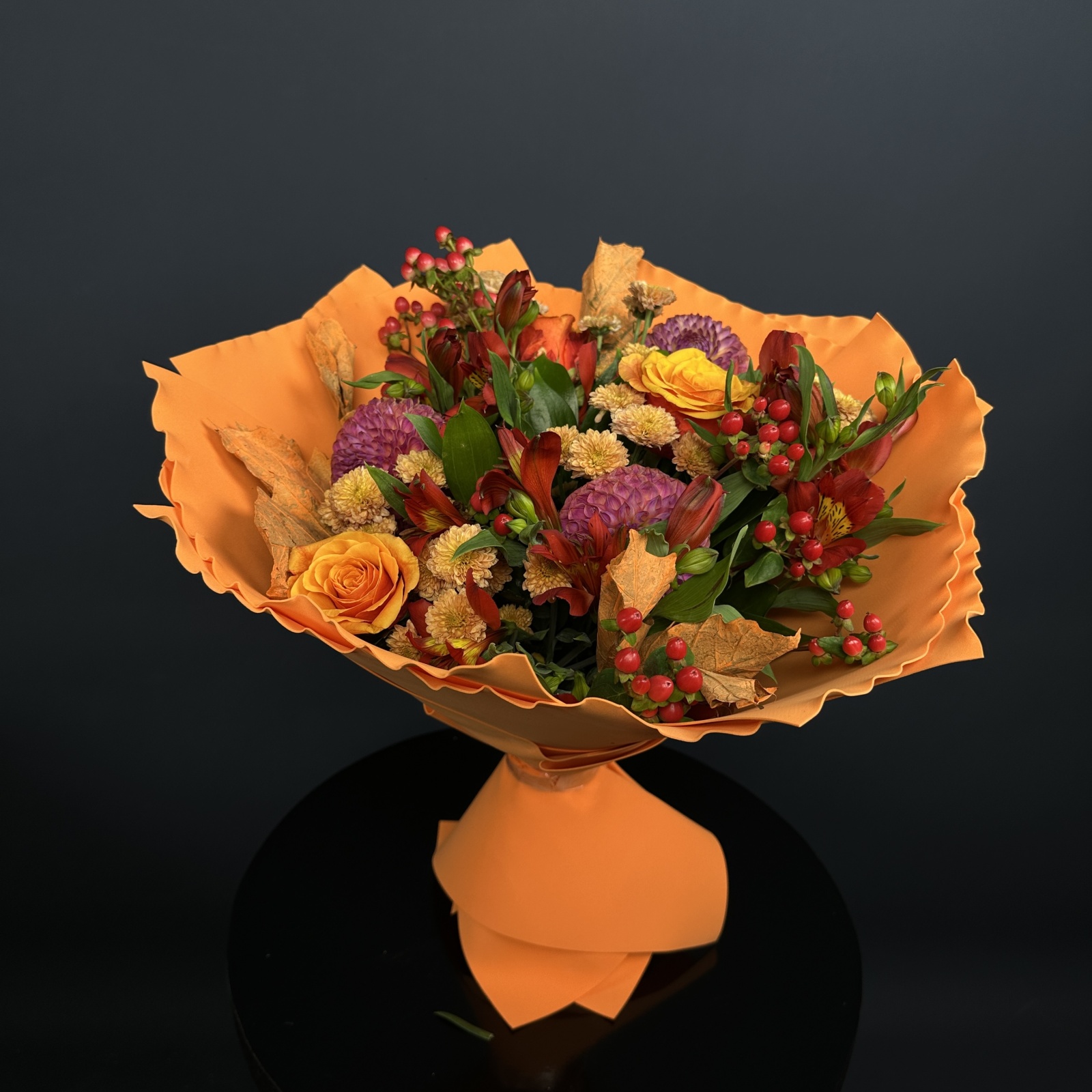 Состав: хризантема 6, роза 3, альстромерия 3, гладиолус 3, гиперикум 2, рускус 0,5 и прочее. под заказ