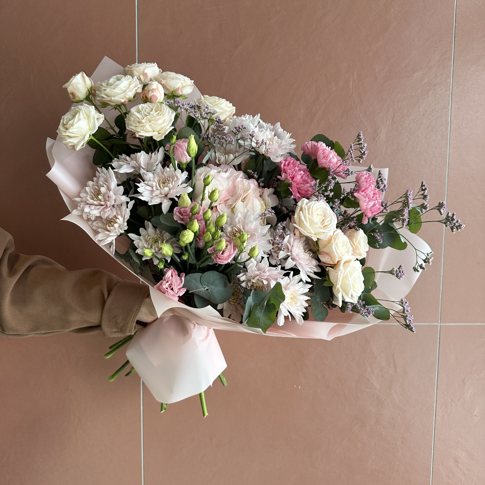 Состав: хризантема кустовая 3, гвоздика 3, роза кустовая 2, эвкалипт 2, гортензия 1, лизиантус 1, лимониум 1 и прочее. под заказ