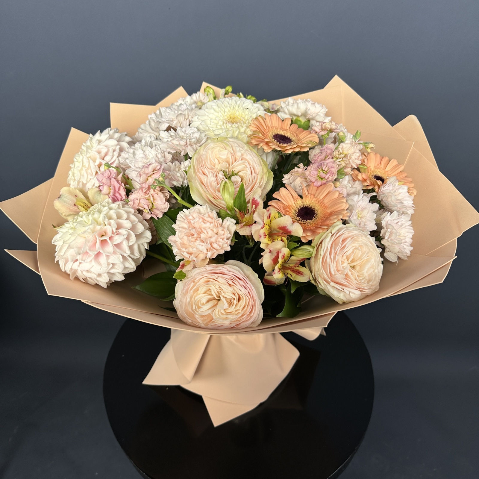 Состав: роза 4, хризантема кустовая 4, гербера 3, альстромерия 3, гвоздика 3, маттиола 2, рускус 0,5 и прочее. под заказ
