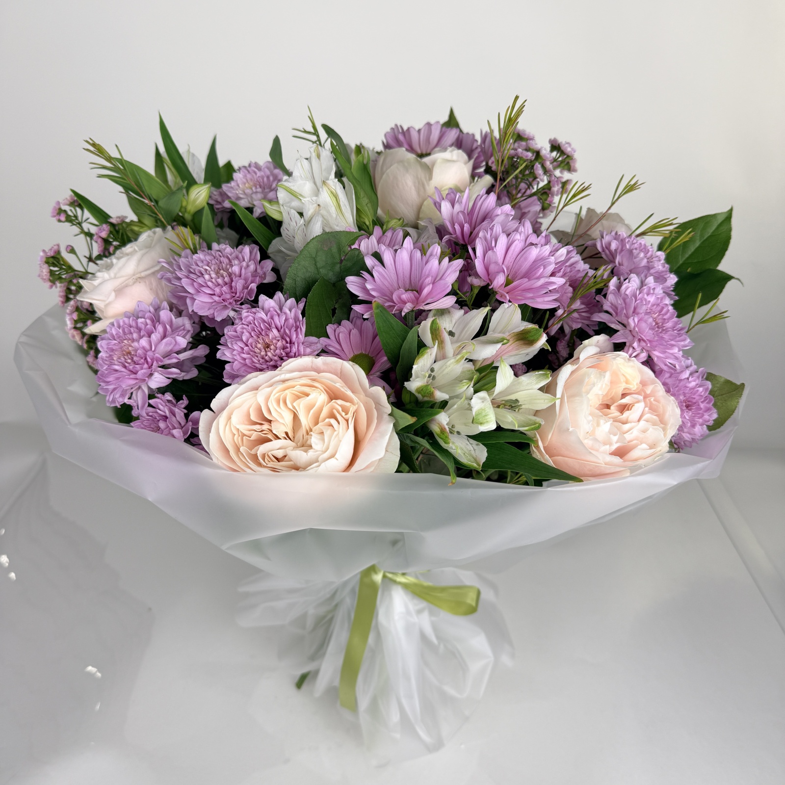 Состав: роза 9, хризантема кустовая 6, альстромерия 4, хамелациум 2 и прочее. в наличии