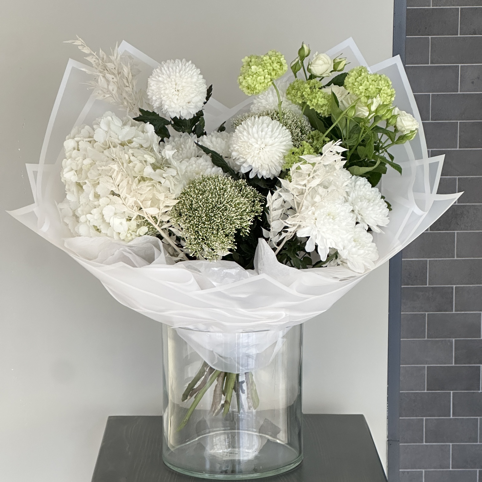 Состав: хризантема 3, рускус 3, хризантема кустовая 2, гортензия 1, вибурнум 1, роза кустовая 1, фисташка 0,5 и прочее. под заказ