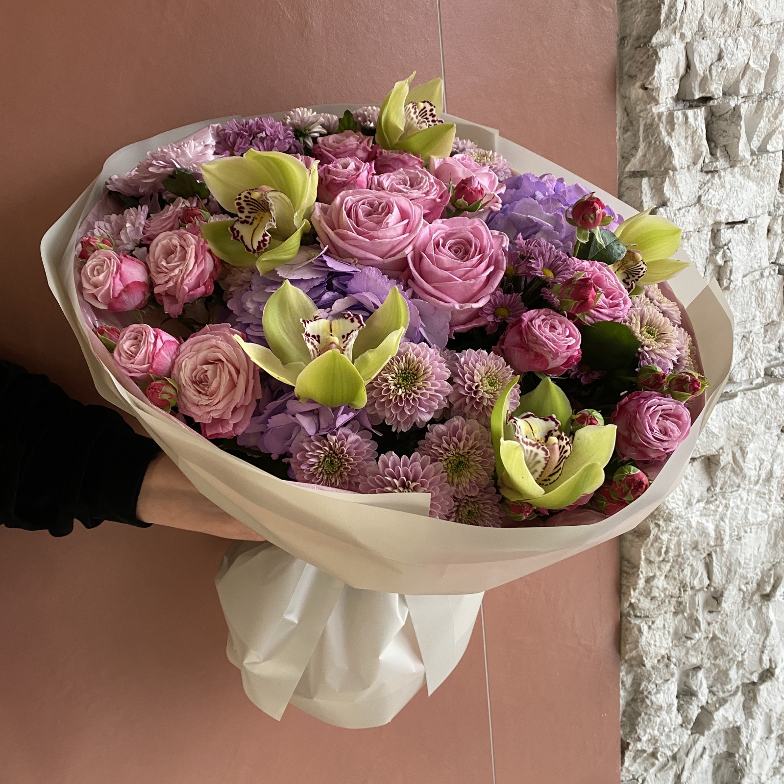 Состав: хризантема кустовая 5, хризантема 3, роза 3, роза кустовая 3, гортензия 2, рускус 0,6, ветка цимбидиум 0,4 и прочее.