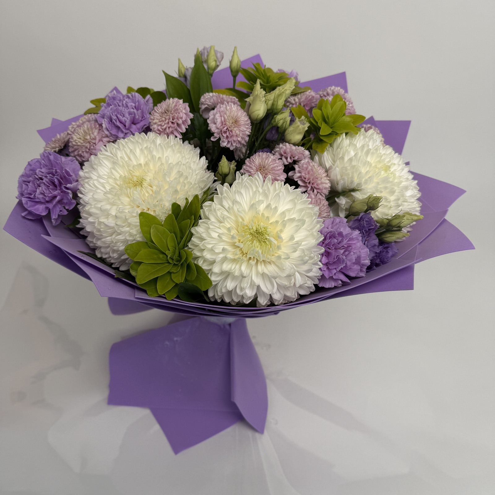 Состав: гвоздика 5, хризантема кустовая 5, хризантема 3, лизиантус 3, чоисия 2, роза 1, рускус 0,5 и прочее. под заказ