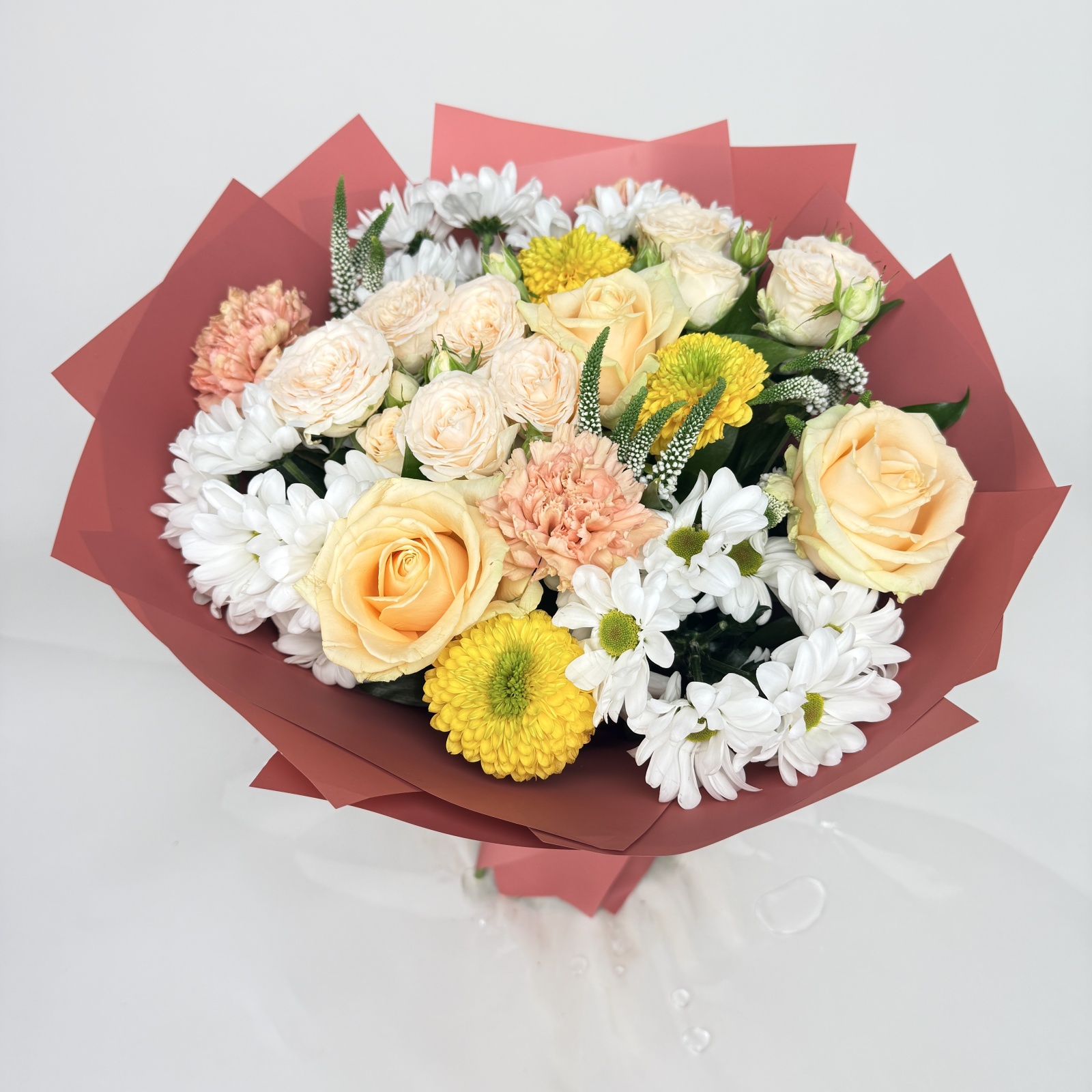 Состав: хризантема кустовая 5, хризантема 3, роза 3, гвоздика 3, роза кустовая 2, рускус 0,5 и прочее. в наличии
