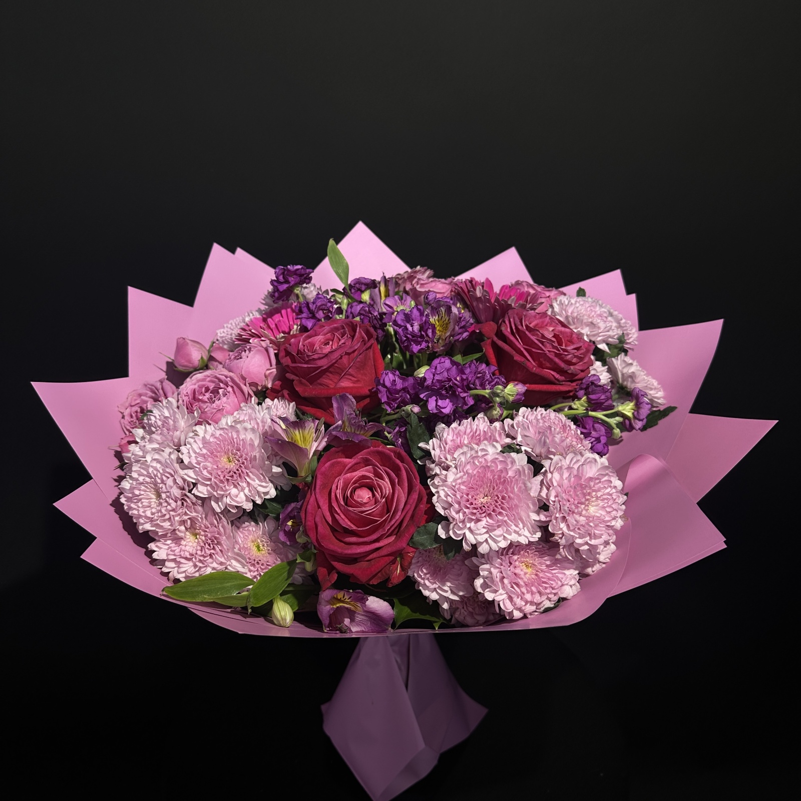 Состав: хризантема кустовая 4, гербера 3, роза 3, альстромерия 3, роза кустовая 2, маттиола 2, рускус 0,5 и прочее. в наличии