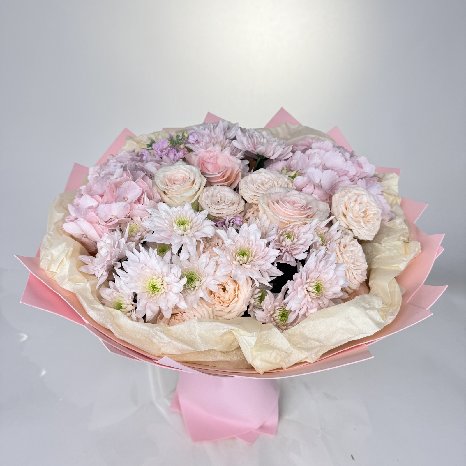 Состав: роза 3, роза кустовая 3, хризантема кустовая 3, маттиола 3, гортензия 2, тюльпан 1, фисташка 0,7 и прочее. в наличии