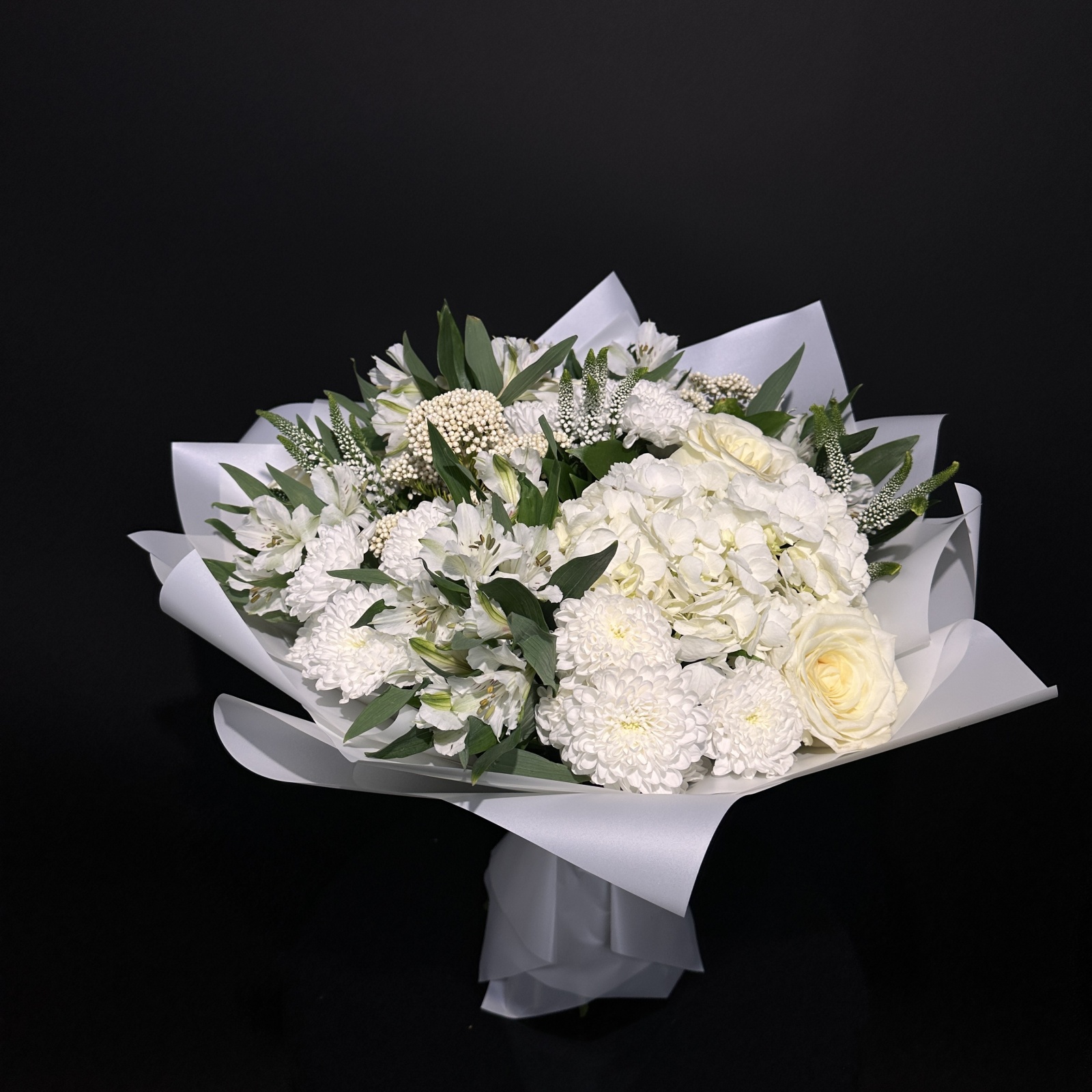 Состав: альстромерия 6, роза 5, хризантема кустовая 4, гортензия 1, рускус 1 и прочее. в наличии