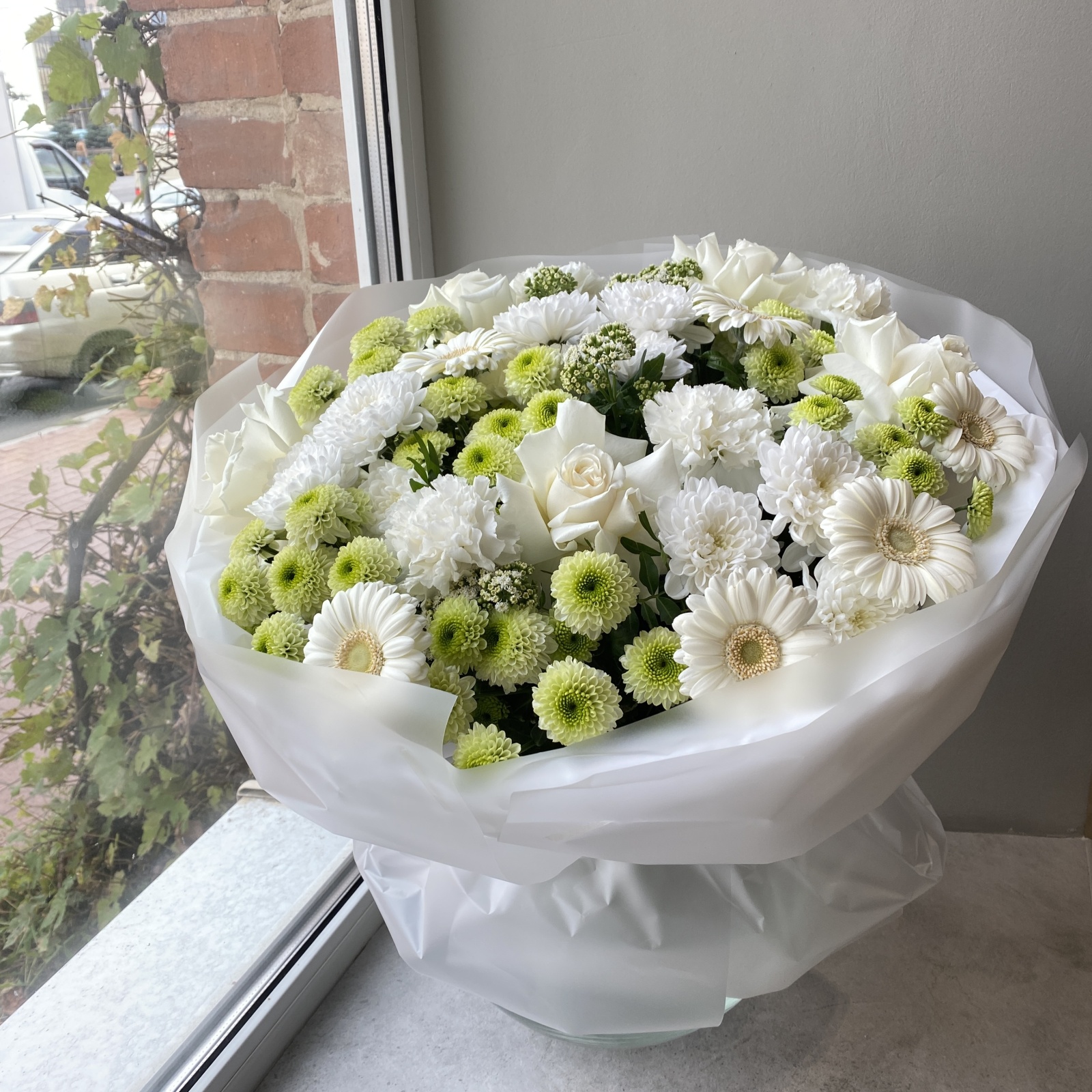 Состав: гербера 6, хризантема 5, роза 5, гвоздика 4, хризантема кустовая 4, фисташка 1 и прочее. под заказ