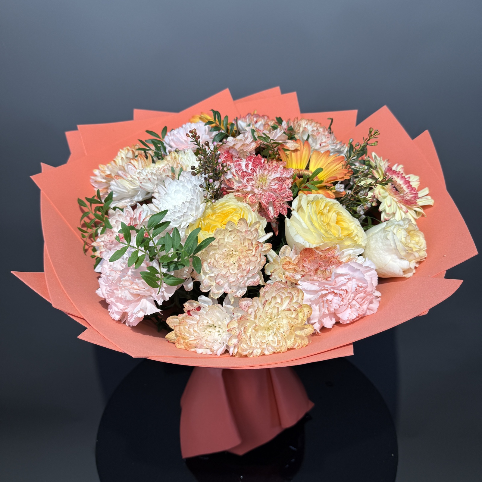 Состав: хризантема кустовая 5, роза 5, гвоздика 3, хамелациум 3, гербера 3, пион 1, фисташка 1 и прочее. под заказ