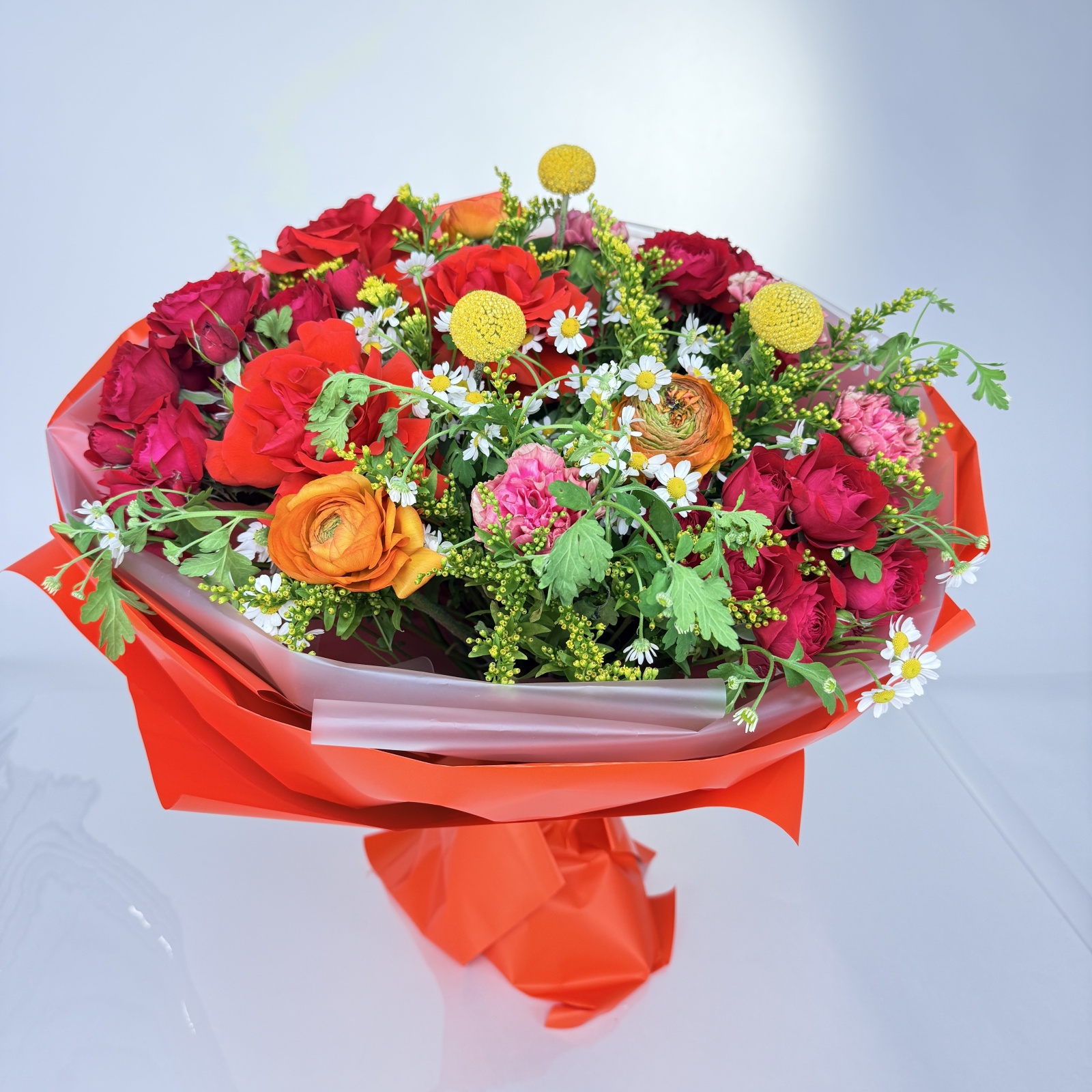 Состав: гвоздика 4, роза 4, роза кустовая 3, ранункулюс 3, солидаго 3 и прочее. в наличии