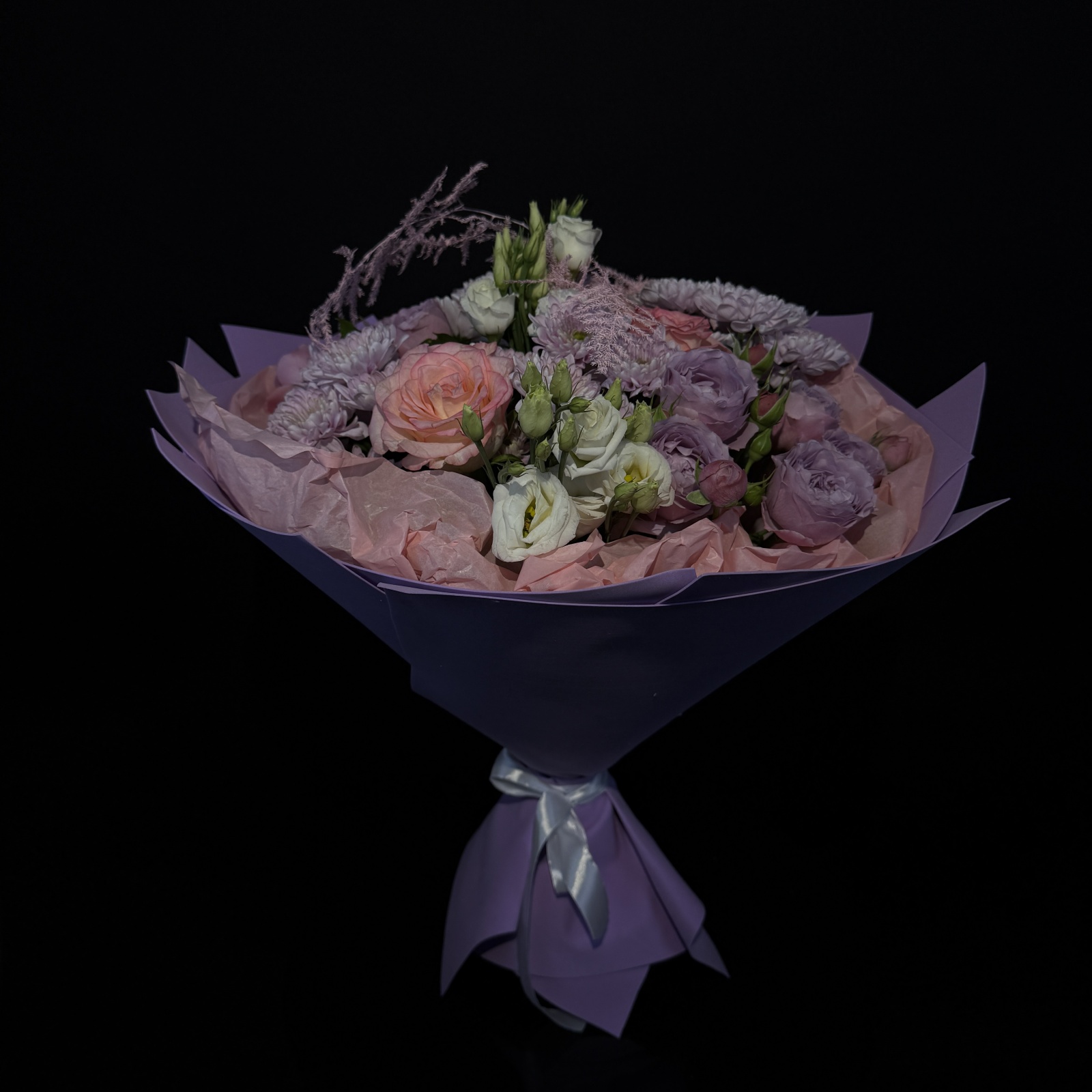 Состав: хризантема кустовая 4, роза 3, роза кустовая 2, лизиантус 2, хризантема 1, рускус 0,3 и прочее. под заказ