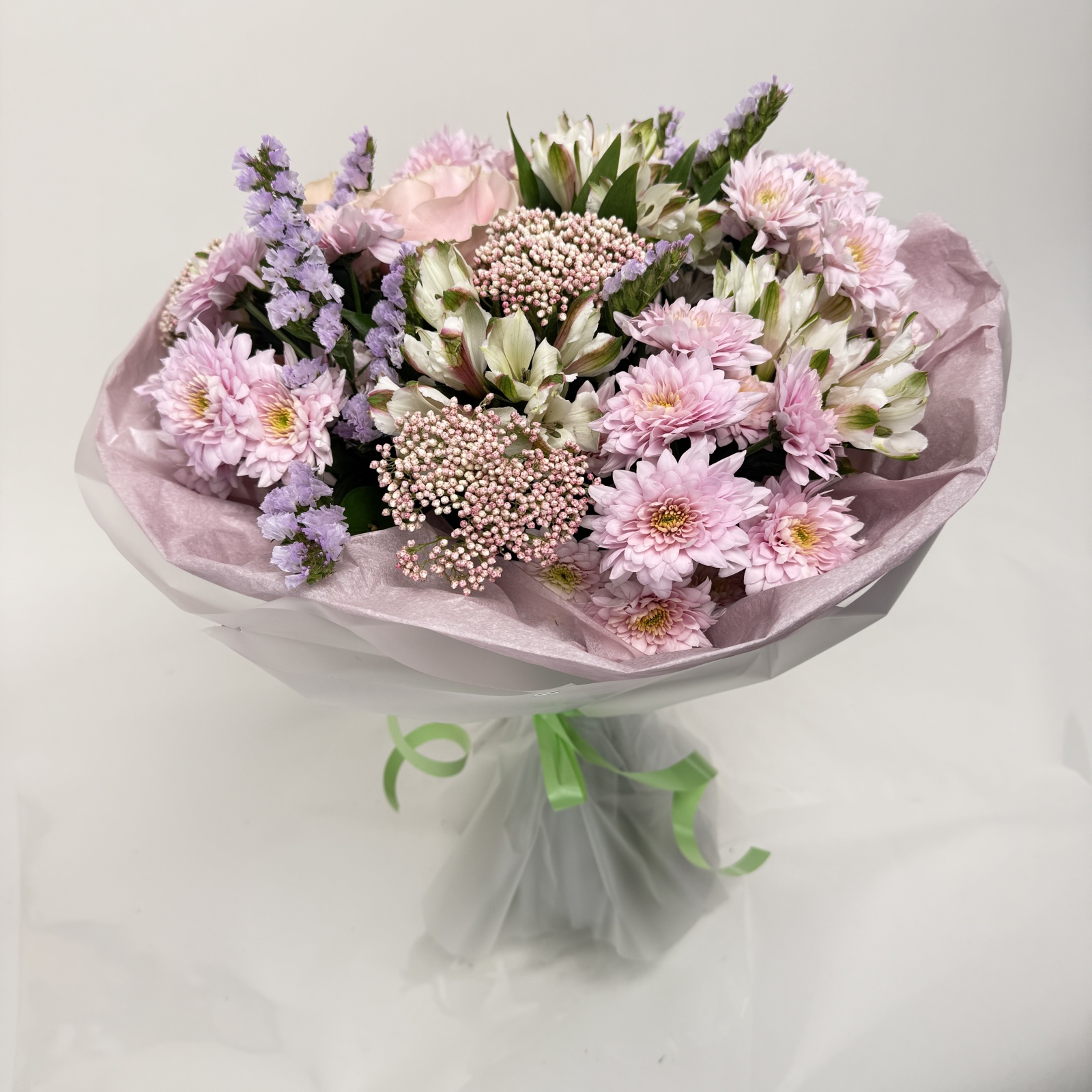 Состав: альстромерия 6, хризантема кустовая 6, роза 3, статица 2, рускус 0,5 и прочее. под заказ