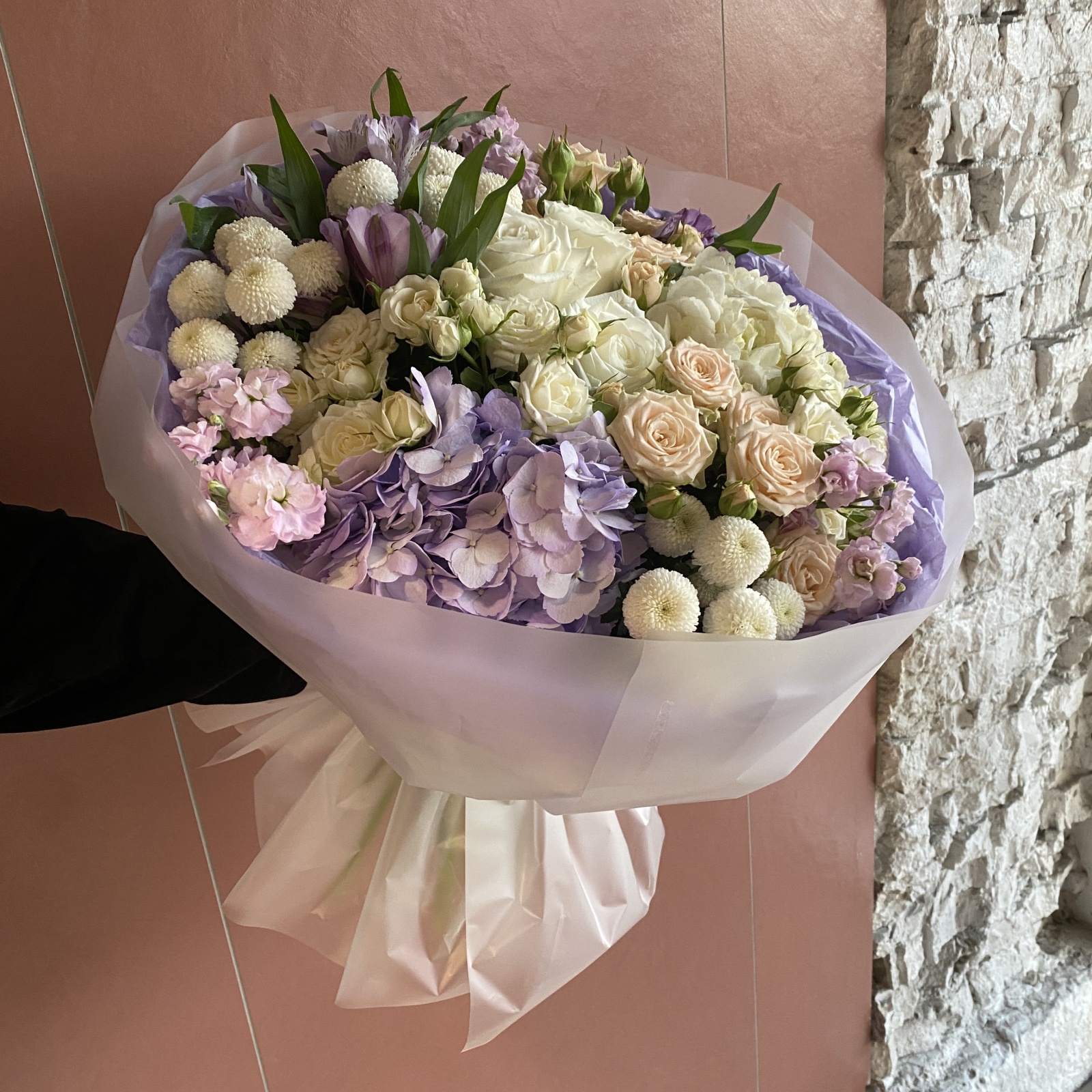 Состав: роза кустовая 4, хризантема кустовая 3, роза 3, альстромерия 3, маттиола 3, гортензия 2, фисташка 0,6, рускус 0,3 и прочее.