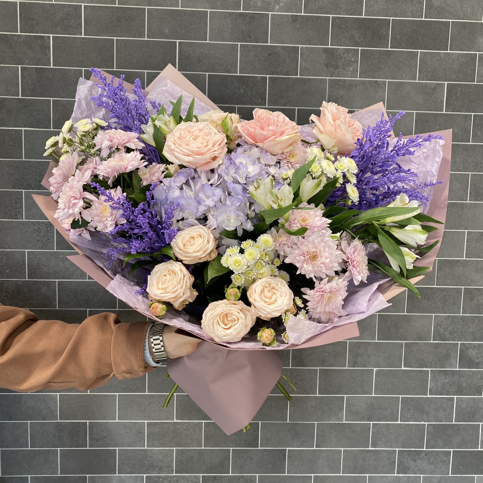 Состав: хризантема кустовая 6, роза 3, альстромерия 3, солидаго 3, роза кустовая 2, гортензия 1, рускус 0,5 и прочее. под заказ