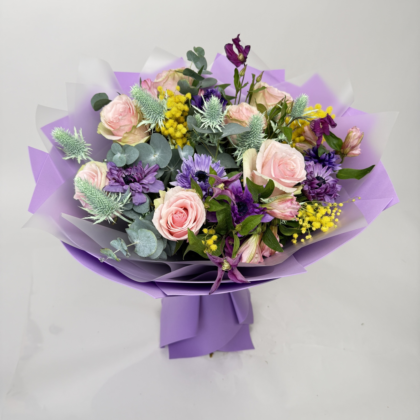 Состав: роза 7, анемон 7, альстромерия 3, эвкалипт 2, эрингиум 2 и прочее. в наличии